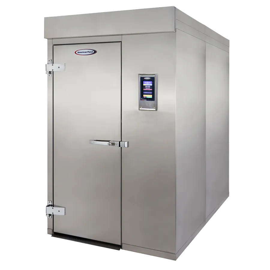 Introducing the American Panel Corporation AP36BCF-2T Blast Chiller Freezer, Roll-In. Crafted for commercial restaurant use, this modular blast chiller/shock freezer is a game-changer in cold storage solutions. With its remote refrigeration system, it can accommodate up to two trolleys measuring 31" W x 38" D x 73.5" H, providing ample space for your culinary creations. The chiller boasts an impressive chill capacity of 720 lbs. from 160F to 38F in just 90 minutes, while the freezer can freeze 432 lbs. from 160F to 0F in 240 minutes. The 7" LCD touch screen controller with Quick Start & A La Carte functionality ensures easy operation and programmability. Made with insulated panels and a stainless steel interior and exterior, this blast chiller/freezer is built to last. Whether you need to chill or freeze, the American Panel Corporation AP36BCF-2T is the ultimate solution for your commercial restaurant needs.
