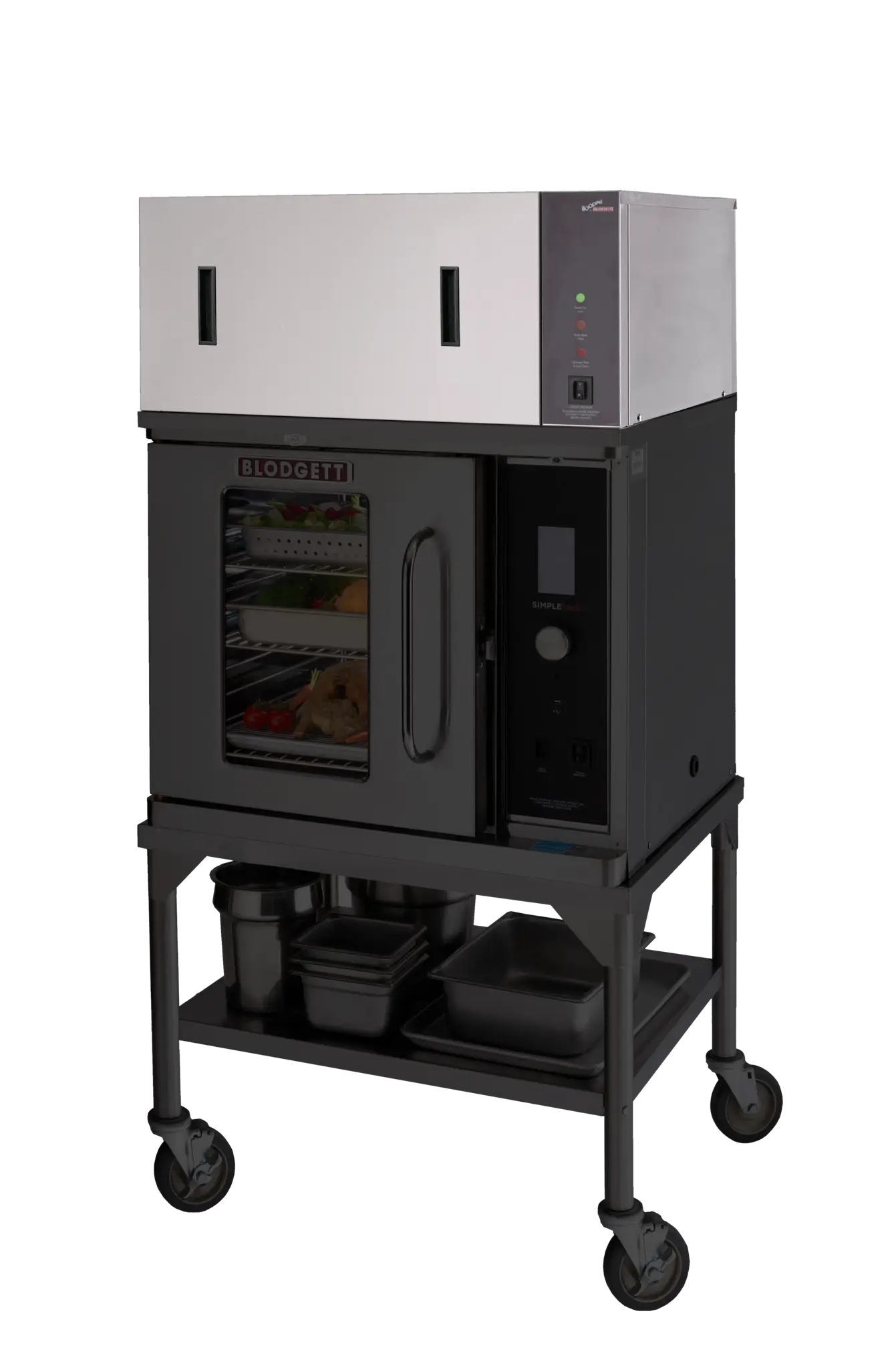 BREAK FREE FROM HOOD SYSTEMS! Hood systems use immense amounts of energy. A good way to help get foodservice in line with carbon neutrality is to invest in ventless equipment. The Hoodini VLH pulls air in and circulates it along the catalytic converter. The excess gets pulled up to the hood and passes through a filter. The fan pulls the air up from the filter and out of the back of the unit. The Hoodini convection hood collects and filters exhaust from the oven cavity(ies). The "scrubbed” air is then returned to the kitchen. Works in conjunction with a catalyst ring which reacts with grease laden vapor before before it escapes the hood. The system is connected to the ovens using duct work to pull the oven exhaust up and into the hood. Allows you to think outside of the designated hood space in the kitchen. Maximize your kitchen space with this 0” required top clearance Power is provided from the oven, no additional electrical supply is needed. No water or drain required. Ships with one hood filter. Replacement filters available. AVAILABLE FOR -Mark V-100 standard depth convection oven -Mark V-200 bakery depth convection oven -Zephaire-100-E standard depth convection oven -Zephaire-200-E bakery depth convection oven