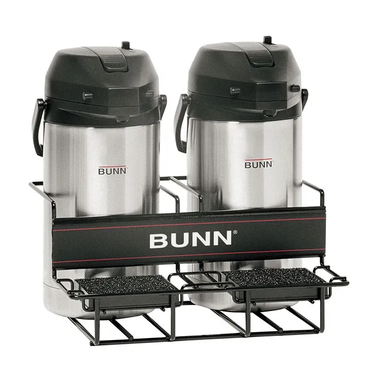 Upgrade your commercial restaurant with the Bunn 35728.0001 Airpot Serving Rack. This universal airpot rack is designed to enhance your serving efficiency and elevate your customer experience. With two lower racks, it can display two push-button or lever-action airpots (not included), allowing you to offer a variety of hot beverages to your patrons. The carbon-steel wire construction ensures durability and longevity, even in a busy restaurant environment. The sponge-lined tray provides a secure and stable base for the airpots, preventing spills and accidents. Whether you're serving coffee, tea, or hot water, this airpot serving rack is a must-have for any commercial restaurant. Trust Bunn, a reputable vendor in the industry, to deliver superior performance and quality. Upgrade your beverage service today with the Bunn 35728.0001 Airpot Serving Rack.