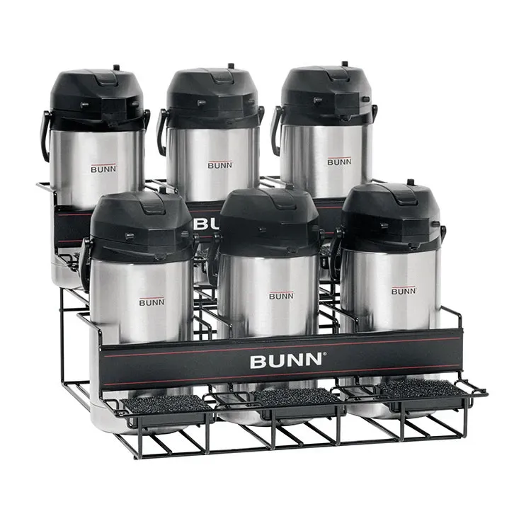 Set the standard with top-tier tools with the Bunn, 35728.0005, Airpot Serving Rack. This universal airpot rack from Bunn is designed to enhance efficiency and organization in commercial restaurant settings. Made with carbon-steel wire construction, this rack is durable and built to last. It features three lower and upper racks, allowing you to display up to six push-button or lever-action airpots (not included). The sponge-lined tray ensures that your airpots stay in place and are protected from scratches. With its sleek design and sturdy construction, this airpot serving rack is a must-have for any restaurant looking to streamline their beverage service. Whether you're serving coffee, tea, or hot water, this rack will keep your airpots easily accessible and neatly displayed. Elevate your restaurant's beverage service with the Bunn, 35728.0005, Airpot Serving Rack.