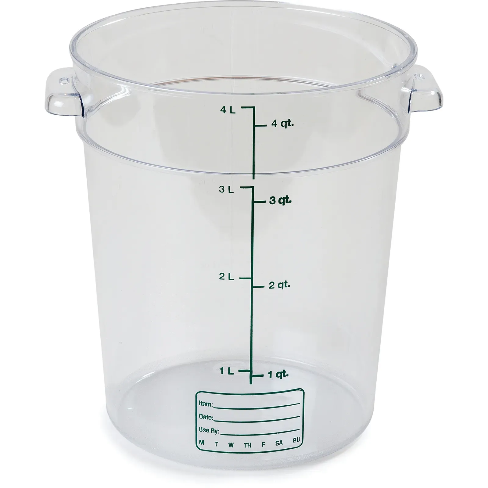 Introducing the Carlisle 1076407 Food Storage Container, a must-have for commercial restaurants looking to craft culinary wonders. Made in the USA, this container is designed to meet the rigorous demands of a busy kitchen. With a capacity of 4 quarts, it provides ample space for storing ingredients, leftovers, and prepared dishes. The molded-in capacity indicators make it easy to measure and portion out food accurately. The container features easy-grip handles, allowing for effortless transportation and handling. Its spoonable bottom ensures every last bit of food can be easily accessed and served. The stackable design maximizes storage space, while the clear polycarbonate material allows for quick identification of contents. Dishwasher safe and NSF certified, this container is not only convenient but also meets the highest standards of hygiene. Trust Carlisle for durable, reliable, and restaurant-grade food storage solutions.
