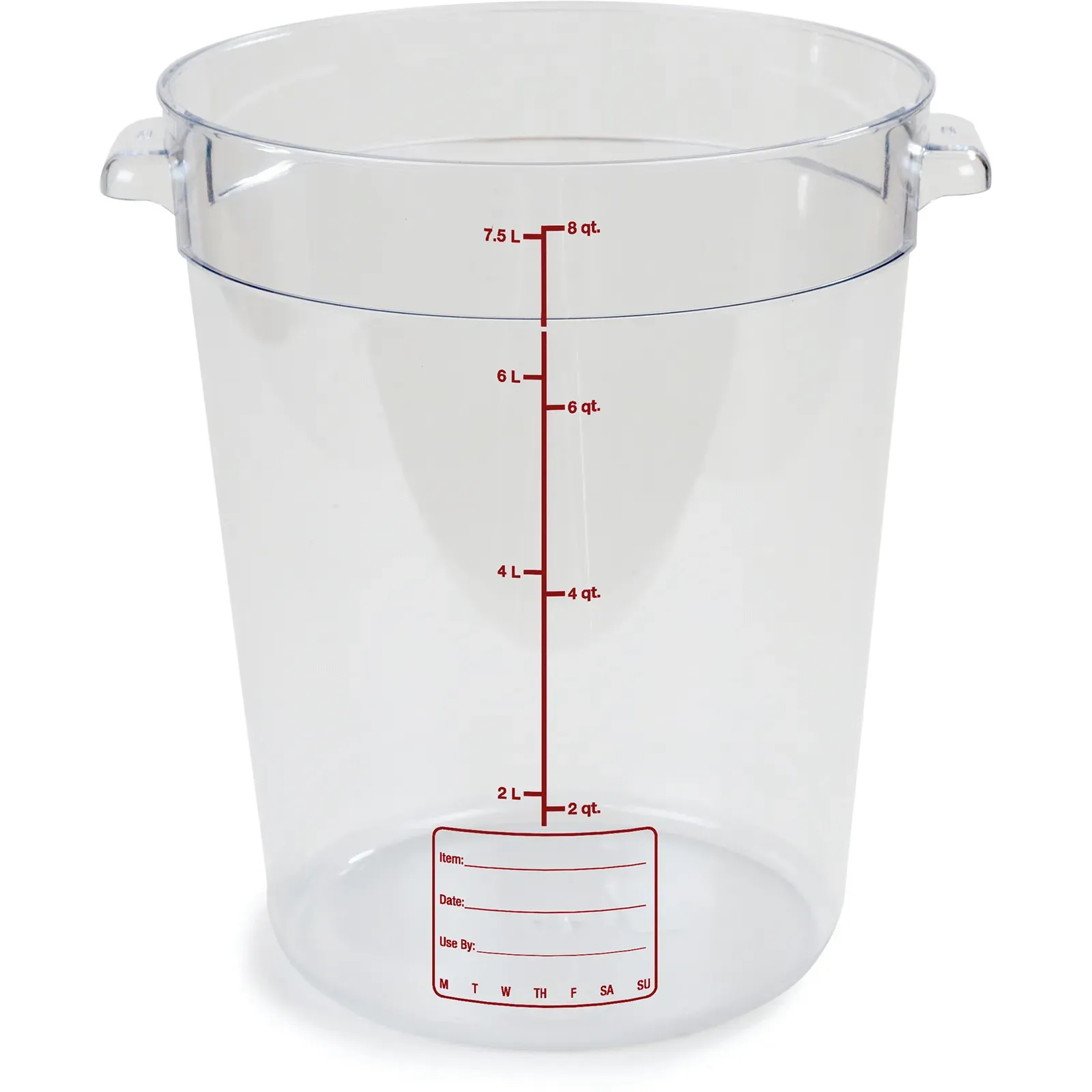 Introducing the Carlisle 1076607 Food Storage Container, the perfect addition to elevate your restaurant's reputation with the right equipment. Designed for commercial restaurant use, this container is a must-have for any professional kitchen. With a capacity of 8 quarts, it provides ample space to store and organize your ingredients. The molded-in capacity indicators make it easy to measure and portion your food accurately, ensuring consistency in your recipes. The easy-grip handles allow for effortless transportation, while the spoonable bottom design allows for easy access to every last bit of food. Made of durable polycarbonate, this container is stackable and dishwasher safe, saving you valuable time and space. Its clear construction allows for quick identification of contents, streamlining your food preparation process. NSF certified and proudly made in the USA, the Carlisle 1076607 Food Storage Container is a reliable and efficient solution for all your restaurant's storage needs.