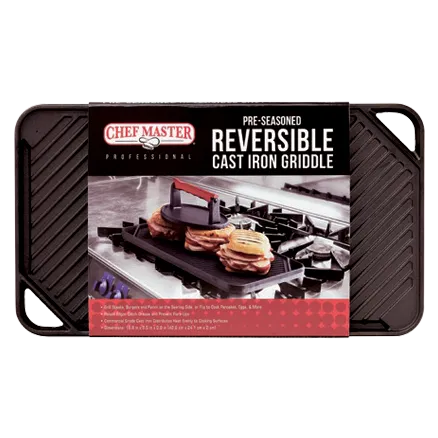 Introducing the Chef Master, 90202, Cast Iron Grill / Griddle Plate, designed to maximize restaurant productivity. This versatile griddle features a reversible ribbed and flat surface, allowing chefs to create a variety of dishes with ease. The raised edges prevent any spills or drips, ensuring a clean and efficient cooking experience. Made from pre-seasoned cast iron, this griddle offers exceptional heat retention and distribution, resulting in perfectly cooked meals every time. Its compact size of 16-4/5" x 9-1/2" x 4/5"H makes it ideal for small kitchens or food trucks, without compromising on performance. Whether you're grilling steaks, searing vegetables, or making pancakes, this cast iron grill/griddle plate is a must-have for any professional kitchen.