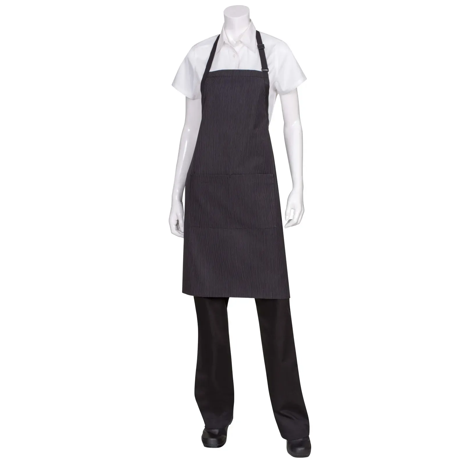 Unleash culinary passion in uniform with the Chef Works AB012PNS0 Bib Apron. Designed by Chef Works, a trusted name in the industry, this apron is perfect for commercial restaurant use. Whether you're an executive chef, lead bartender, or work in the butcher section of your local grocery store, this apron is a must-have. Made from durable and reliable 65/35 yarn-dyed poly/cotton, it can withstand the demands of a busy kitchen. The adjustable neck buckle ensures a comfortable fit for all-day wear. The contrasting black ties add a touch of elegance to the apron's pinstripe design. With a patch-pocket featuring a center divide, you can keep your essentials close at hand. Elevate your professional image with the Chef Works AB012PNS0 Bib Apron.
