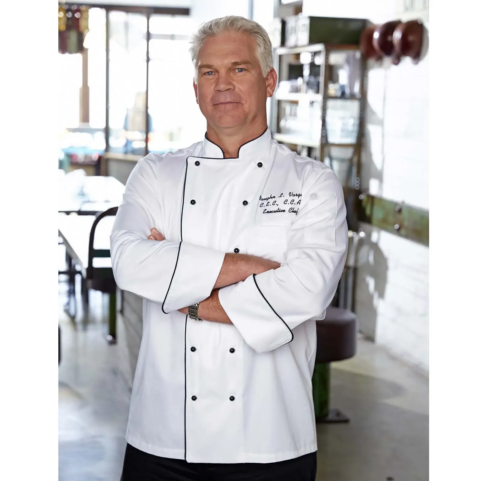 Crafted for chefs, adored by kitchens. Introducing the Chef Works MICCWHTXL Chef's Coat, a must-have for any culinary professional. This classic double-breasted coat exudes elegance with its white fabric and black piping accents on the collars, cuffs, and center front. Made with a 65/35 poly/cotton blend, it offers both comfort and durability, perfect for the fast-paced environment of a commercial restaurant. The long sleeves and French cuffs add a touch of sophistication, while the underarm vents ensure breathability during long hours in the kitchen. With (2) removable black plastic stud button strips, this coat allows for customization and versatility. Designed by Chef Works, a trusted name in the industry, this coat is a symbol of professionalism and expertise. Elevate your culinary style and command respect in the kitchen with the Newport Executive Chef Coat.