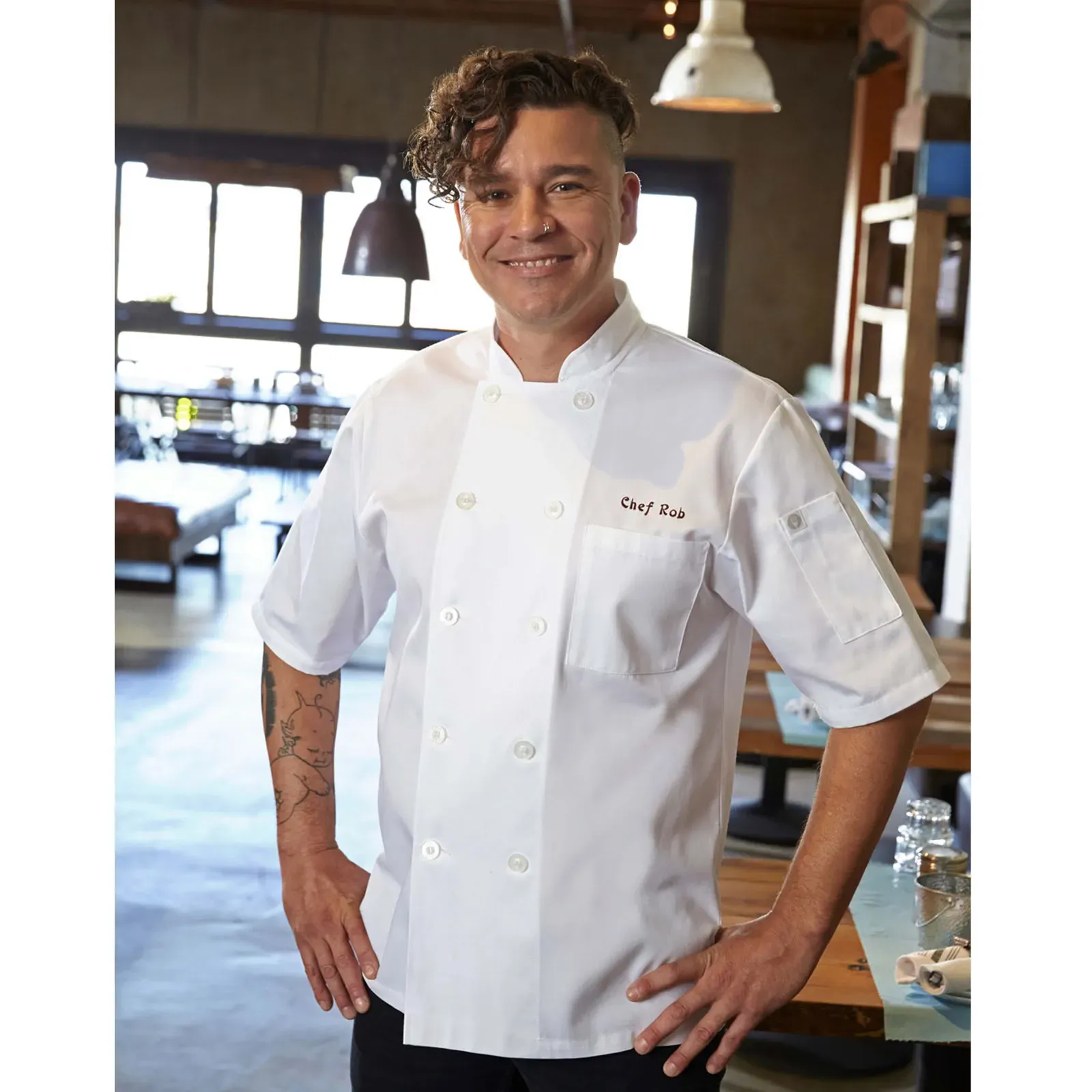 Crafted for chefs, admired by kitchens. Introducing the Chef Works PCSSWHTL Chef's Coat, an entry-level essential for culinary students of all levels. This double-breasted jacket takes a no-frills approach to getting the job done, with short sleeves and matching buttons for a clean and professional look. Made with a classic fit, this chef coat features a left chest patch and thermometer pocket, providing convenience and functionality in a fast-paced commercial restaurant setting. The 65/35 poly/cotton blend ensures durability and comfort, allowing chefs to focus on their craft without distractions. Whether you're a culinary student or a seasoned professional, this solid and reliable chef coat should be a staple in every chef's wardrobe. Elevate your culinary journey with the Chef Works PCSSWHTL Chef's Coat.