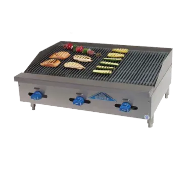 Equip your kitchen for superior culinary mastery with the Comstock-Castle 3236RB Charbroiler. This gas countertop charbroiler is designed to meet the demands of a commercial restaurant setting. With a 36" wide x 32" deep frame and a 36" wide x 24" deep grill area, it provides ample space for grilling a variety of meats and vegetables. The inverted "V" angle iron radiants ensure even heat distribution, while the cast iron top grates deliver excellent heat retention and searing capabilities. The manual control allows for precise temperature adjustments, giving you full control over your cooking process. The stainless steel splash guard and frame make it easy to clean and maintain, while the 4" adjustable feet ensure stability on any countertop. With a powerful 90000 BTU output, this charbroiler is NSF certified and built to withstand the rigors of a busy commercial kitchen. Elevate your culinary creations with the Comstock-Castle 3236RB Charbroiler.