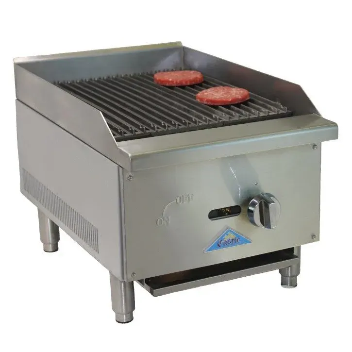 Set the culinary standard with top-tier equipment. The Comstock-Castle CCERB16 Charbroiler is a must-have for any commercial restaurant. This countertop gas charbroiler is designed to deliver exceptional performance and durability. With a 16" wide x 27" deep frame and a 16" x 18" deep cook surface, it provides ample space for grilling a variety of meats and vegetables. The cast iron grates ensure even heat distribution and create beautiful grill marks on your food. The 10 ga. stainless steel radiants and stainless steel splash guard help to minimize flare-ups and make cleaning a breeze. The stainless steel front and galvanized sides add a sleek and professional look to your kitchen. Equipped with a manual control and 30,000 BTU, this charbroiler offers precise temperature control and powerful heat output. ETL and ETL-Sanitation certified, this Comstock-Castle charbroiler guarantees safety and reliability. Upgrade your restaurant's grilling capabilities with the Comstock-Castle CCERB16 Charbroiler.