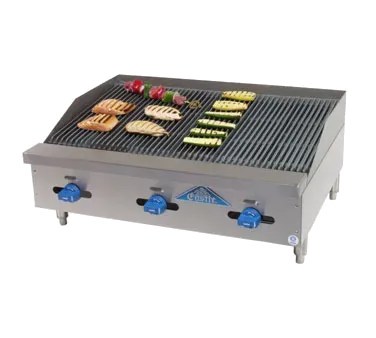 Elevate kitchen efficiency with top-tier equipment. Introducing the Comstock-Castle FHP36-3RB Gas Countertop Charbroiler, a must-have for any commercial restaurant. This high-performance charbroiler is designed to meet the demands of a busy kitchen, ensuring quick and consistent cooking results. With a 36" wide x 21" deep cooktop broil surface and cast iron grates, it provides ample space for grilling a variety of meats and vegetables. The iron radiants and stainless steel splash guards on three sides help distribute heat evenly and prevent flare-ups, while the stainless steel exterior finish adds durability and a sleek look. Equipped with three manual controls and a powerful 75000 BTU burner, this charbroiler offers precise temperature control and efficient cooking. NSF and ETL certified, it guarantees safety and reliability. Upgrade your restaurant's grilling capabilities with the Comstock-Castle FHP36-3RB Gas Countertop Charbroiler.