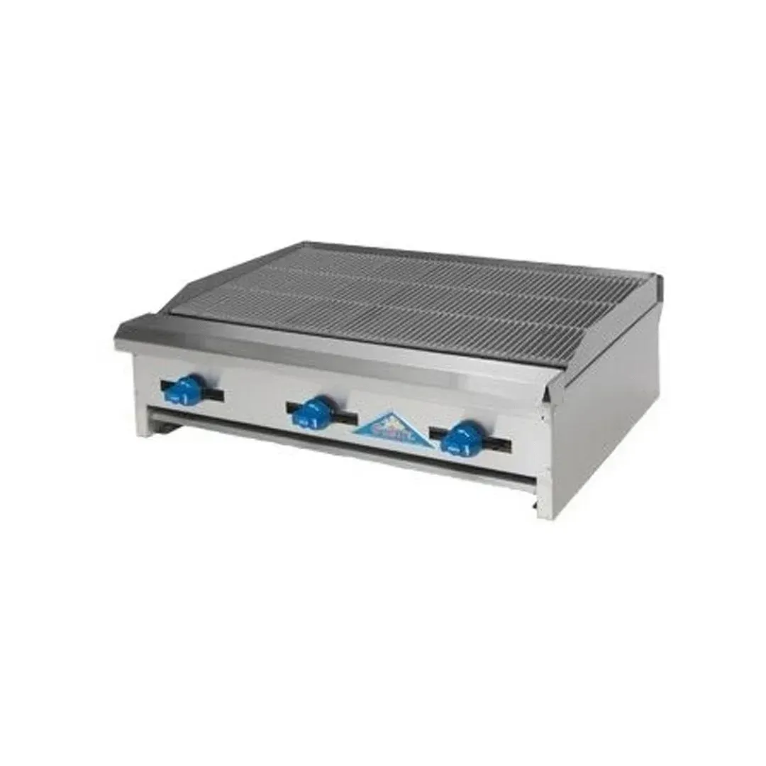 Elevate your culinary creations with our premium countertop Char-Broiler, designed for those who demand excellence in their cooking equipment. Perfect for kitchens of all sizes, this gas-powered marvel boasts a robust 60" wide by 28" deep frame, providing ample space for sizzling up your signature dishes. The expansive 60" x 21" deep cooktop broil area, paired with durable cast iron grates and iron radiants, ensures even heat distribution and exceptional grilling results every time. With the power of 165,000 BTU at your fingertips, you'll master high-volume cooking effortlessly. Encased in a sleek, stainless steel exterior with matching splash guards on three sides, this charbroiler not only stands up to the rigors of a bustling kitchen but also adds a touch of modern elegance to any setting. The four-inch stainless steel legs provide sturdy support, while the 3/4" gas connection ensures seamless integration into your setup. Certified by NSF and ETL, this unit guarantees quality and safety, making it an indispensable addition to your culinary arsenal. Whether you're searing steaks to perfection or crafting char-grilled vegetables, this charbroiler is your ticket to professional-grade results with every meal.