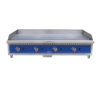 Introducing the Globe GG48G Gas Countertop Griddle, designed to drive restaurant profitability. This 48" wide griddle is a must-have for any commercial kitchen. Its 1" highly polished griddle plate is fully welded to a stainless steel frame, ensuring durability and even heat distribution. With manual controls every 12", you have precise control over the cooking process. The individual adjustable pilots with front access make ignition quick and easy. The 4" wide grease trough helps keep your cooking surface clean and the stainless steel double wall construction with an extended cool-to-touch front edge ensures safety. The GG48G is equipped with 4" adjustable heavy-duty stainless steel legs for stability and convenience. With a total BTU of 120,000, this griddle delivers powerful performance. It comes with a natural gas setup and includes an LP conversion kit. Upgrade your restaurant's cooking capabilities with the Globe GG48G Gas Countertop Griddle.