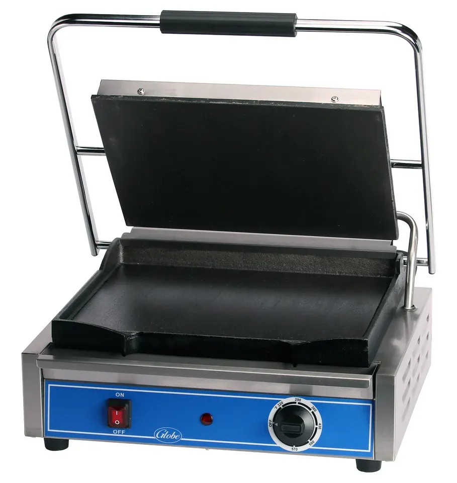 Revolutionize your cooking setup with the Globe GSG1410 Sandwich / Panini Grill. This high-quality grill is designed to meet the demands of a commercial restaurant kitchen. The 14"x10" seasoned cast iron smooth griddle plates ensure even heat distribution and excellent heat retention, allowing you to achieve perfect results every time. The stainless steel construction not only adds durability but also makes cleaning a breeze. The heavy-duty hinge ensures that the grill stays securely closed, while the adjustable stainless steel non-skid feet provide stability on any countertop. With its on/off switch and catch tray, this grill offers convenience and ease of use. Powered by 1800 watts, it delivers the power you need to cook your sandwiches and paninis to perfection. NSF and cULus certified, this Globe Sandwich / Panini Grill is a reliable and efficient addition to any commercial kitchen.
