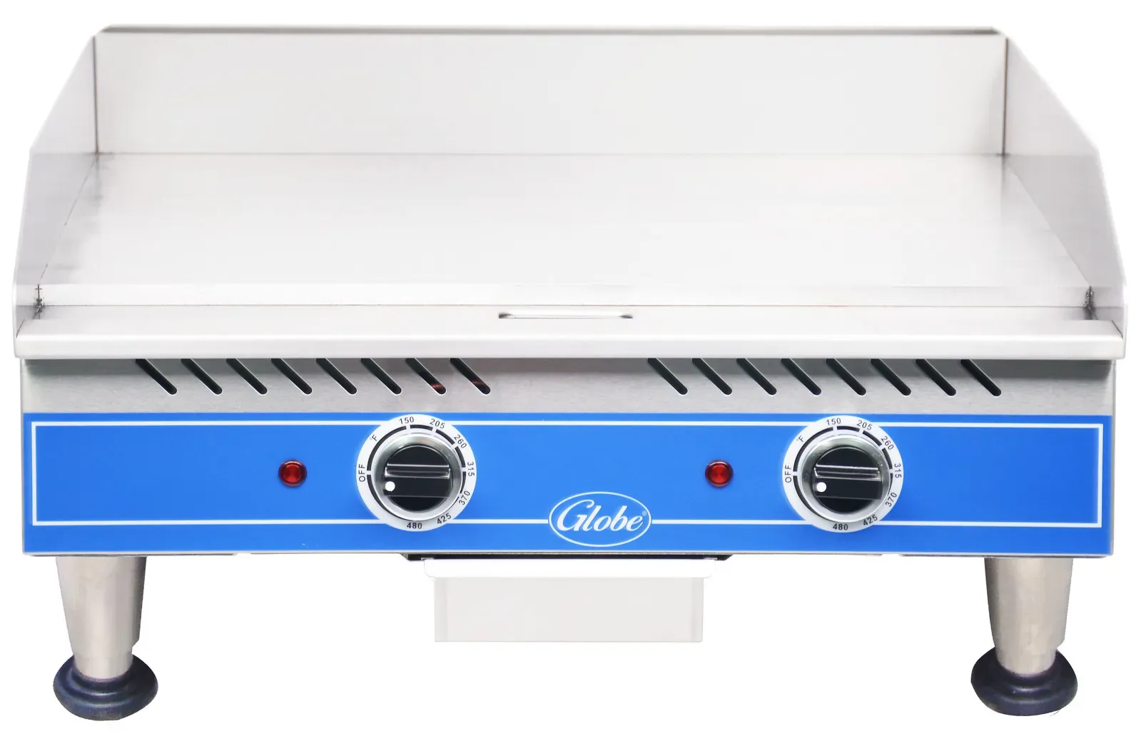 Cook with precision using the Globe PG24E Electric Countertop Griddle. This high-quality griddle is designed for commercial restaurant use, offering a reliable and efficient cooking solution. With a plate depth of 13" and a 3/8" thick griddle surface, this electric griddle provides even heat distribution and excellent heat retention, ensuring consistent cooking results every time. The griddle features two 70-575F thermostat controls, allowing you to adjust the temperature to suit different cooking needs. It also has an on/off switch for each element, providing precise control over the cooking process. The stainless steel removable catch tray with a 4-1/2 cup capacity makes cleaning up a breeze. With its splash guard on three sides, this griddle helps to keep your kitchen clean and safe. The adjustable feet ensure stability on any countertop surface. Trust the Globe PG24E Electric Countertop Griddle to deliver exceptional performance and durability in your commercial kitchen.