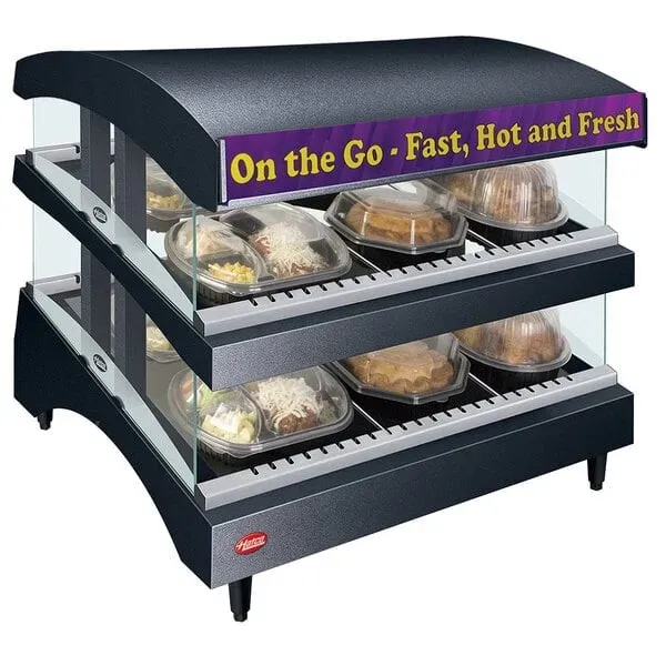 Boost your restaurant's performance with the Hatco GR3SDS-27DCT Merchandiser. This Glo-Ray Designer Slant Display Warmer is designed to enhance your food presentation and attract customers. With its curved canopy top and tempered glass side panels, this merchandiser creates an enticing display that showcases your delicious offerings. The adjustable thermostat allows you to control the temperature and keep your food at the perfect serving condition. The hardcoated heated base and heated glass shelves ensure even heat distribution, keeping your food warm and fresh. The LED display lights illuminate your products, making them even more appealing to customers. The built-in front sign holder allows you to customize your display and promote your specials. Made in the USA and UL EPH Classified, this Hatco merchandiser is a reliable and durable addition to your restaurant. Upgrade your food presentation and boost your sales with the Hatco GR3SDS-27DCT Merchandiser.