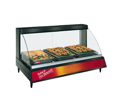 Transform your food service with the Hatco GRCD-3P Merchandisers. This Glo-Ray Designer Heated Display Case is perfect for commercial restaurants looking to showcase their delicious food in an attractive and efficient way. The tempered curved glass not only provides a clear view of the food but also adds a touch of elegance to any countertop. With its (3) pan single shelf, you can display a variety of dishes, enticing customers with a mouthwatering selection. The incandescent lighting illuminates the food, making it even more appealing to hungry patrons. The stainless steel interior ensures durability and easy cleaning, while the 4" adjustable counter legs allow for convenient placement. This UL EPH Classified and ANSI/NSF 4 certified display case is a reliable and safe choice for any commercial restaurant. Upgrade your food presentation and attract more customers with the Hatco GRCD-3P Merchandisers.