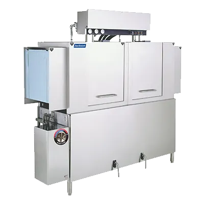 Streamline tasks with advanced technology using the Jackson WWS, AJ-64CS Dishwasher, Conveyor Type. This high-performance dishwasher is designed to meet the demands of a busy commercial restaurant. With its adjustable conveyor speed and approximately 287 racks per hour capacity, it ensures efficient and quick cleaning of dishes. The two-tank design, with a wash and power rinse tank, ensures thorough cleaning and high-temperature sanitizing rinse for optimal hygiene. The 25" clearance through the machine allows for easy loading and unloading of dishes. Made with stainless steel construction, this dishwasher is durable and easy to clean. The steam tank heat and vent fan control provide precise temperature control and efficient drying. Certified by cETLus and NSF, this dishwasher meets the highest industry standards. Upgrade your restaurant's dishwashing process with the Jackson WWS, AJ-64CS Dishwasher, Conveyor Type.
