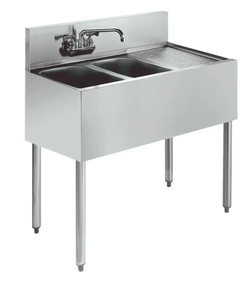 Transform your food service with the Krowne Metal KR19-32L Bar Sink. This Royal Series 36" Two-Compartment Bar Sink is designed to meet the demands of a busy commercial restaurant. With its stainless steel construction and splash mount Royal Series faucet, this bar sink is not only durable but also compliant with low lead regulations. The two compartments, measuring 10" wide x 14" front-to-back x 10" deep, provide ample space for washing and rinsing dishes, while the 12" embossed drainboard on the right offers convenient drying space. The apron on the front and sides adds to the sink's functionality and aesthetic appeal. Additionally, the KR19-32L Bar Sink comes with two removable overflow standpipes and a water line kit for easy installation. Trust Krowne Metal to deliver high-quality, NSF-certified bar sinks that enhance the efficiency and productivity of your restaurant.