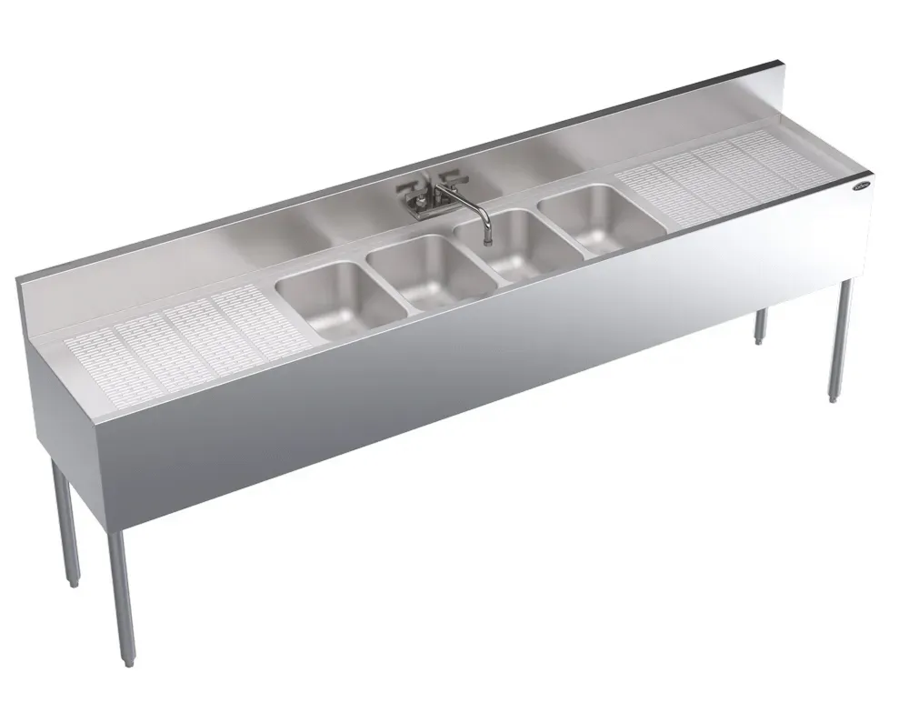Deliver food perfection with the Krowne Metal KR19-84C Bar Sink. This Royal Series 96" Four-Compartment Bar Sink is designed to meet the demands of a busy commercial restaurant. With its spacious 96"W x 19"D size, it provides ample space for washing and rinsing dishes, glasses, and utensils. The four compartments allow for efficient organization and separation of different items, ensuring optimal cleanliness and hygiene. The sink also features two 12" drainboards on the left and right sides, providing convenient space for drying and stacking washed items. Made by Krowne Metal, a trusted vendor in the industry, this bar sink is built to last. Its durable construction and high-quality materials ensure long-lasting performance even in the most demanding restaurant environments. Upgrade your restaurant's dishwashing area with the Krowne Metal KR19-84C Bar Sink and experience the convenience and efficiency it brings to your operations.