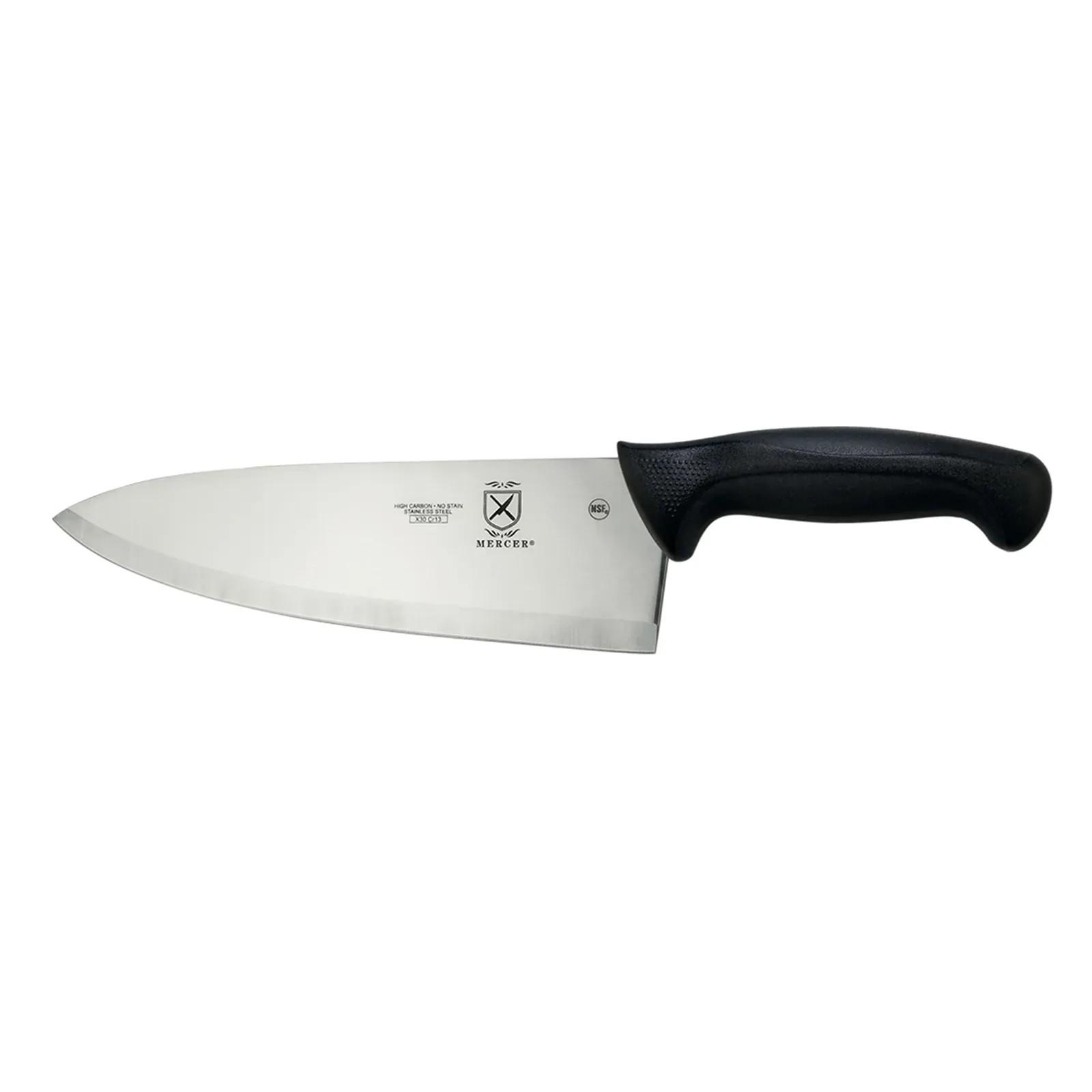 Optimize kitchen workflow with the Mercer Culinary, M18010, Knife, Chef. This 10" wide chef's knife is designed to enhance efficiency and precision in a commercial restaurant setting. The hollow ground blade is made of high carbon, Japanese stain-resistant steel, ensuring durability and long-lasting performance. The black non-slip Santoprene and polypropylene handle provides a comfortable grip, with textured finger points and a protective finger guard for added safety. NSF certified, this knife meets the highest standards of quality and sanitation. Whether you're slicing, dicing, or chopping, the Mercer Culinary M18010 Chef's Knife is a must-have tool for any professional chef or cook. Upgrade your kitchen arsenal with this top-quality knife and experience the difference it makes in your culinary creations.