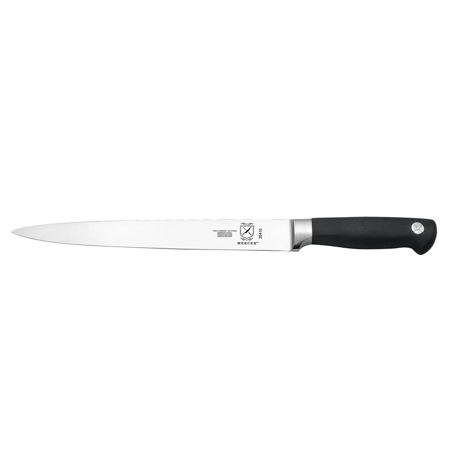 Elevate kitchen operations with the Mercer Culinary, M20410, Knife, Carving. This 10" carving knife is a must-have tool for any commercial restaurant. Crafted with precision forged, high carbon, no-stain German steel, it ensures exceptional durability and long-lasting performance. The black non-slip Santoprene handle provides a secure grip, allowing for precise and effortless carving. NSF certified, this knife meets the highest standards of safety and sanitation in a professional kitchen. Whether you're slicing through succulent roasts or carving up a Thanksgiving turkey, this Mercer Culinary carving knife delivers exceptional results every time. Trust in its quality and reliability to enhance your culinary creations and impress your customers. Upgrade your kitchen arsenal with the Mercer Culinary, M20410, Knife, Carving.