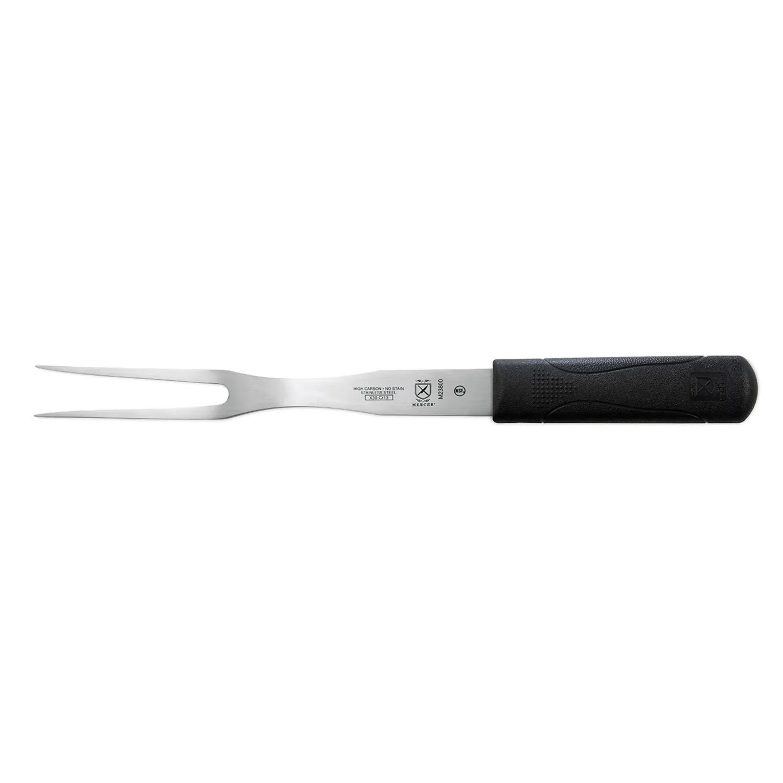 Maximize kitchen productivity with the Mercer Culinary, M23800, Cook's Fork. This essential tool is designed to meet the demands of a commercial restaurant setting, ensuring efficiency and precision in every culinary task. The 8" blade, made from high carbon, stain-resistant steel, provides exceptional durability and sharpness, allowing for easy piercing and lifting of meats and other ingredients. With an overall length of 13-1/2", this fork offers optimal control and balance, making it ideal for carving and serving. The Santoprene and polypropylene handle ensures a comfortable grip, even during extended use. NSF certified, this cook's fork meets the highest standards of safety and sanitation.