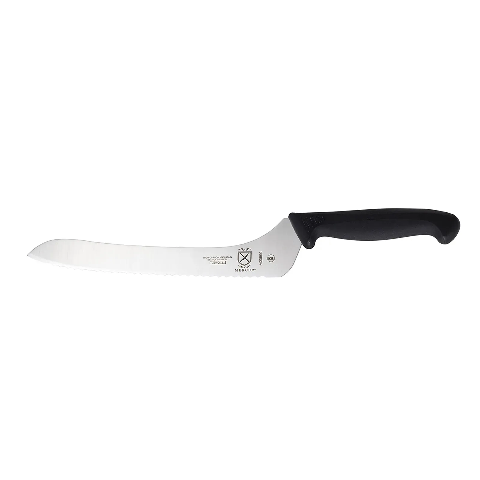 Maximize kitchen productivity with the Mercer Culinary, M23890, Knife, Bread / Sandwich. This 9" Offset Bread Knife is designed to effortlessly slice through crusty bread and delicate sandwiches, making it an essential tool for any commercial restaurant. The wavy edge of the blade ensures clean, precise cuts, while the high carbon, Japanese stain-resistant steel provides exceptional durability and sharpness. The black non-slip Santoprene and polypropylene handle offers a comfortable grip, with textured finger points and a protective finger guard for added safety. NSF certified, this knife meets the highest standards of quality and hygiene. Trust Mercer Culinary for reliable, professional-grade knives that will enhance your restaurant's culinary experience.