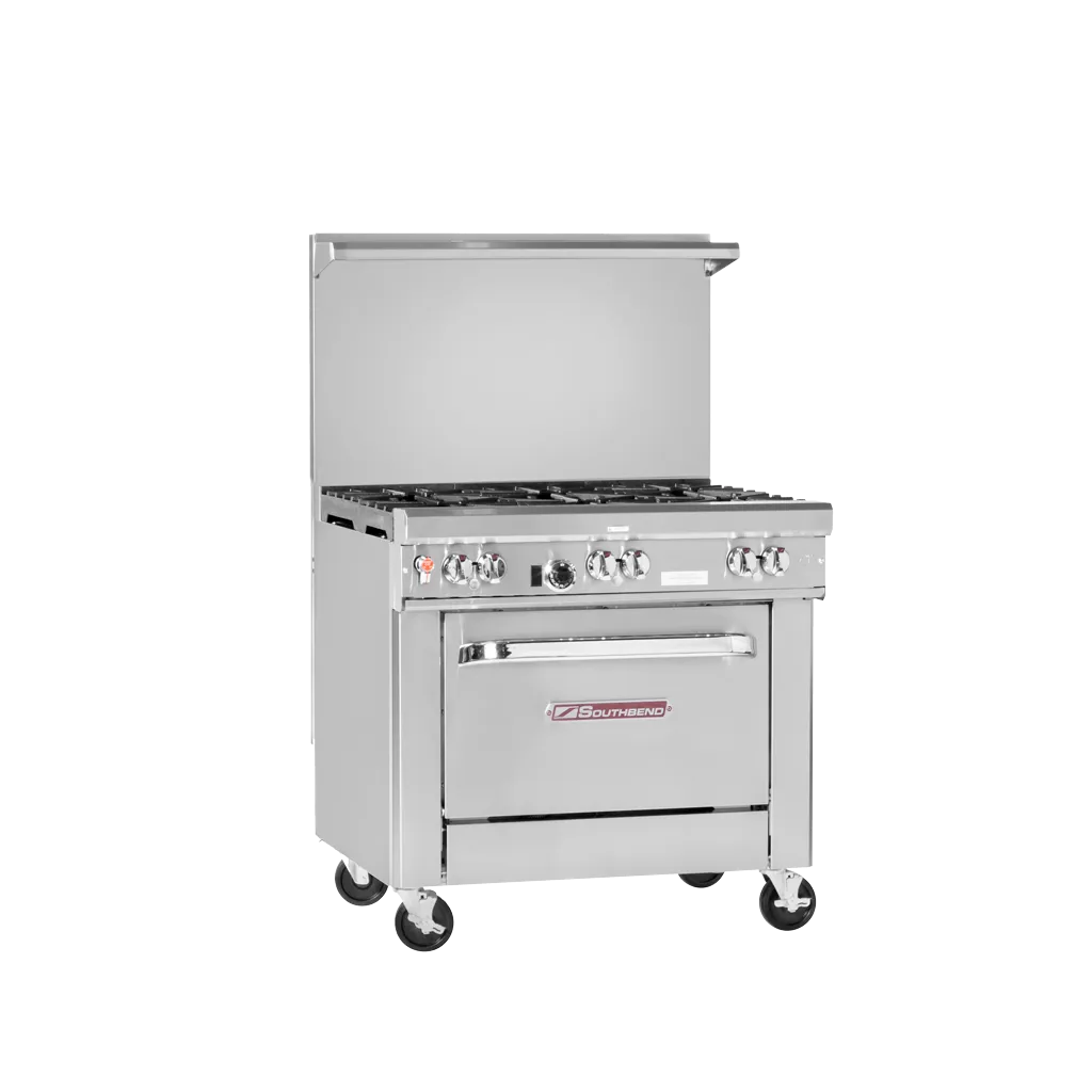 Mobilize your kitchen with the Southbend, 4367D, Range, 36" Restaurant, Gas. This ultimate restaurant range is designed to meet the demands of a busy commercial kitchen. With four powerful pyromax burners, you can easily cook multiple dishes simultaneously, increasing efficiency and productivity. The standard grates provide a sturdy and reliable cooking surface, while the standing pilot ensures quick and easy ignition. The range also features a standard oven with battery spark ignition, allowing you to bake and roast with precision. The included rack provides ample space for your culinary creations. The stainless steel front, sides, shelf, and adjustable legs not only add durability but also give the range a sleek and professional appearance. With a whopping 205000 BTU, this range delivers exceptional cooking performance. CSA and NSF certified, this Southbend range is a reliable and safe choice for any commercial restaurant. Mobilize your kitchen today with the Southbend, 4367D, Range, 36" Restaurant, Gas.