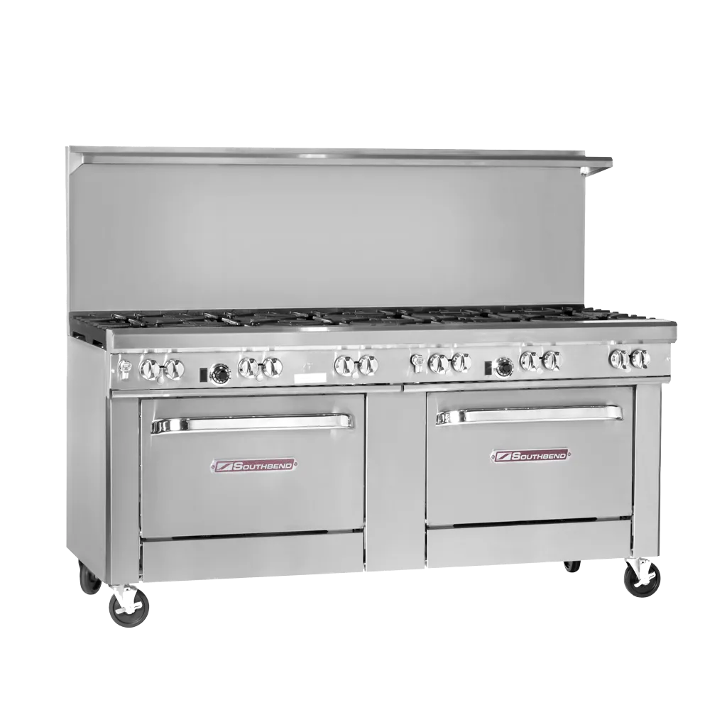 Achieve culinary excellence with the Southbend, 4721AA-5L, Range, 72" Restaurant, Gas. This ultimate restaurant range is designed to meet the demands of a busy commercial kitchen. With its impressive features and specifications, it is the perfect addition to any restaurant looking to elevate their cooking capabilities. The range features three non-clog burners on the front left, two pyromax burners on the rear left, and six non-clog burners on the right, providing ample cooking space for multiple dishes at once. The standing pilot ensures quick and reliable ignition, while the two convection ovens with battery spark ignition offer precise temperature control. Each oven includes three racks, allowing for efficient baking and roasting. The stainless steel construction of the range ensures durability and easy cleaning, while the 22-1/2" flue riser with shelf provides additional storage space. With a powerful 441000 BTU output, this range is CSA and NSF certified, making it a reliable and efficient choice for any commercial restaurant.