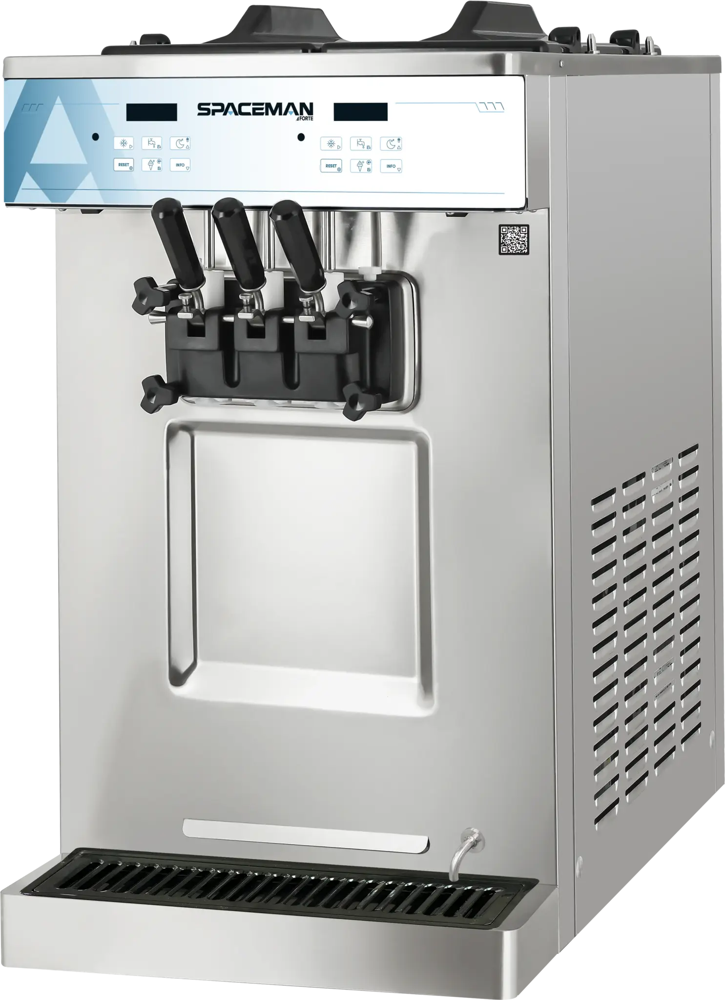 The 6235-C is a premium twin twist (two flavor) countertop, gravity-fed soft serve machine built for operators who need high output and versatility in a compact footprint. It is capable of producing a wide range of products including ice cream, frozen yogurt, custards, and sorbets. With patented freezing technology on its 1.8qt cylinders, the 6235-C delivers super-fast recovery times and can produce over 350 4oz servings per hour, making it a leader in its class for speed and efficiency. At the core of its performance is Spaceman’s patented 100% Controlled Contact Flooded Evaporator, engineered for maximum efficiency to achieve the industry’s fastest freeze-down and recovery times with smaller ice crystals and the smoothest, creamiest mouthfeel. Continuous improvements in design, driven by field feedback and R&D, provide greater structural integrity, reduce failure points, and improve serviceability. The advanced V5 single-piece auger eliminates unnecessary parts, ensures 100% evaporator wall contact, reduces cleaning time, and enhances consistency with the smallest ice crystals in the industry. The dual-system gravity-fed air inlet works in tandem with the V5 auger to optimize overrun and ensure superior texture and long-term product quality. Smart safety controls and independent standby modes maintain hopper and cylinder temperatures below 4.4ºC (40ºF), protecting product quality and conserving energy during non-use. Inverter motor control allows the use of three-phase motors with single-phase power input, reducing torque and strain by controlling start-up speed and minimizing gearbox and drivetrain failures caused by freeze-ups or operational errors. Separate hopper cooling controls independently regulate each hopper to maintain ideal temperatures, prevent sidewall freezing, and optimize output by pre-chilling mix before it enters the freezing cylinder. Dual digital user interfaces make operation simple, while hopper refrigeration and integrated agitators keep mix fresh, stirred, and dairy-safe throughout the day. (When paired with a cart, the 6235-C also serves as a direct replacement for the 6250-C.)