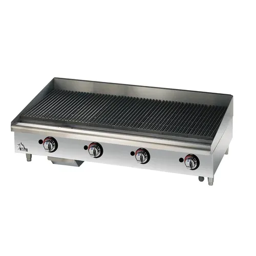 Star-Max radiant and lava rock charbroilers are designed to provide excellent heating and control when preparing a wide variety of products. The units are designed with durability and flexibility in mind with cast iron burners and a control knob for each twelve 12 inch section. The grates have been designed to hold a high capacity of product for maximum efficiency under demanding cooking situations.