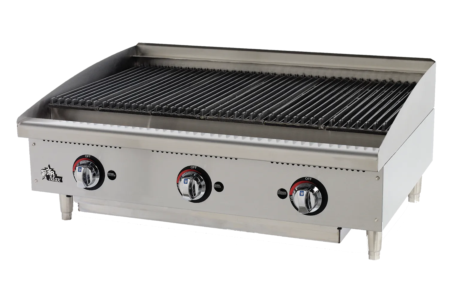 Star-Max radiant and lava rock charbroilers are designed to provide excellent heating and control when preparing a wide variety of products. The units are designed with durability and flexibility in mind with cast iron burners and a control knob for each twelve 12 inch section. The grates have been designed to hold a high capacity of product for maximum efficiency under demanding cooking situations.
