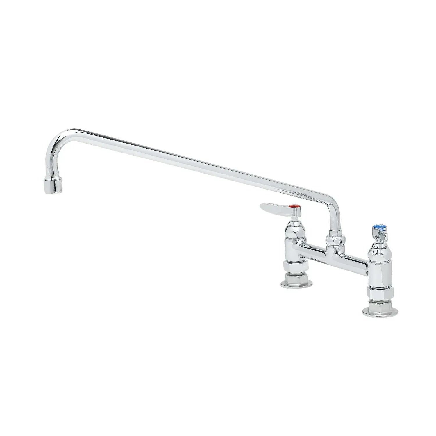 Optimize System Durability with the T&S Brass B-0220 Deck Mount Faucet. Designed specifically for commercial restaurant use, this double pantry faucet is a reliable and efficient choice for any kitchen. With its 8" centers and 18" swing nozzle, this faucet provides easy access to water wherever it's needed. The lever handles offer precise control over water flow and temperature, ensuring a seamless cooking and cleaning experience. The polished chrome plated brass body not only adds a touch of elegance to your kitchen but also enhances the faucet's durability, making it resistant to corrosion and wear. The lock washer provided allows for a rigid application, ensuring the faucet stays securely in place. Trust T&S Brass, a reputable vendor known for their high-quality products, to deliver a deck mount faucet that will withstand the demands of a busy commercial restaurant.