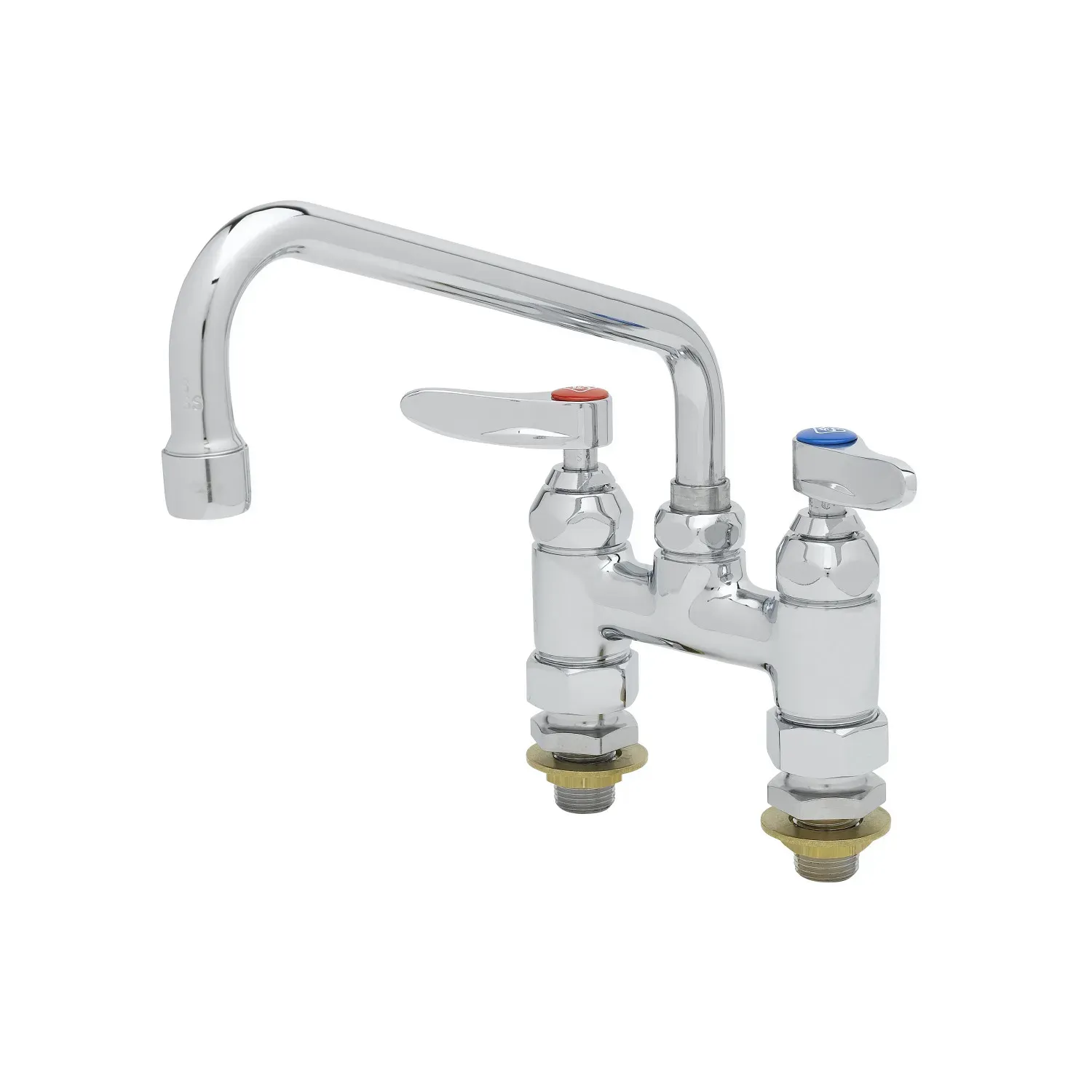 Upgrade Operational Reliability with the T&S Brass B-0227-CC Deck Mount Faucet. Designed specifically for commercial restaurant use, this double pantry faucet is a game-changer in the kitchen. With its 4" centers and 8" swing nozzle (060X), it offers convenience and flexibility for various tasks. The 1/2" NPT male inlets ensure a secure and leak-free connection, while the pressure range of 20 - 125 psi and temperature range of 40°F - 140°F make it suitable for any kitchen environment. With a flow rate of 17.90 GPM at 60 psi, this faucet delivers a powerful stream of water, perfect for rinsing dishes and filling pots quickly. Upgrade your restaurant's operational reliability with this top-notch deck mount faucet.