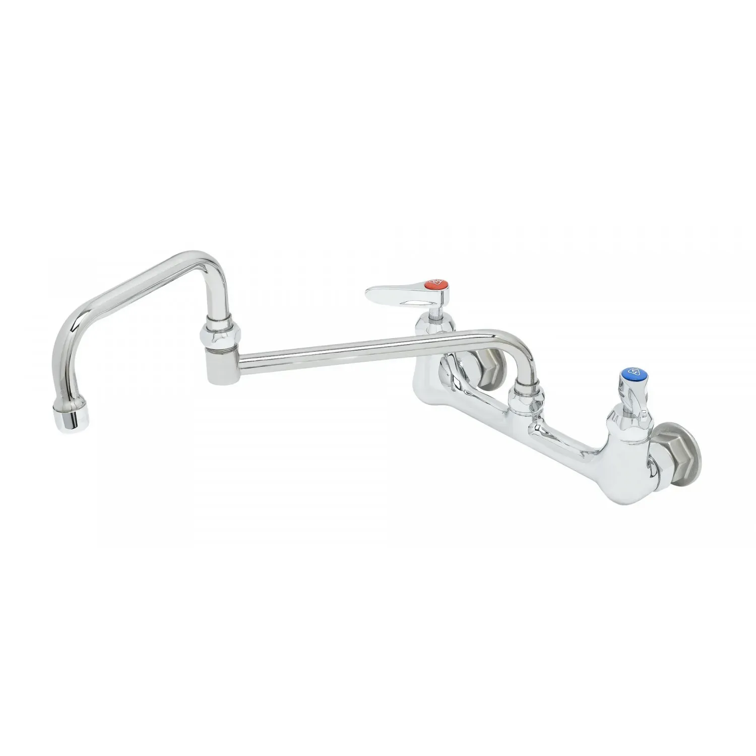 Maximize System Performance with the T&S Brass B-0266-CR-SC Pantry Faucet. Designed specifically for commercial restaurant use, this 8" wall mount mixing faucet is a must-have for any professional kitchen. The polished chrome plated brass body not only adds a touch of elegance but also ensures durability and longevity, even in the busiest of kitchens. The 15" double joint swing nozzle with a 9" back nozzle and 6" front nozzle provides flexibility and ease of use, allowing for precise control over water flow. The check-valve ceramas further enhance the faucet's performance, preventing backflow and ensuring a clean and safe water supply. With a lock washer provided for rigid application, this faucet is easy to install and will seamlessly integrate into your existing plumbing system. Trust T&S Brass for reliable and high-quality restaurant equipment.