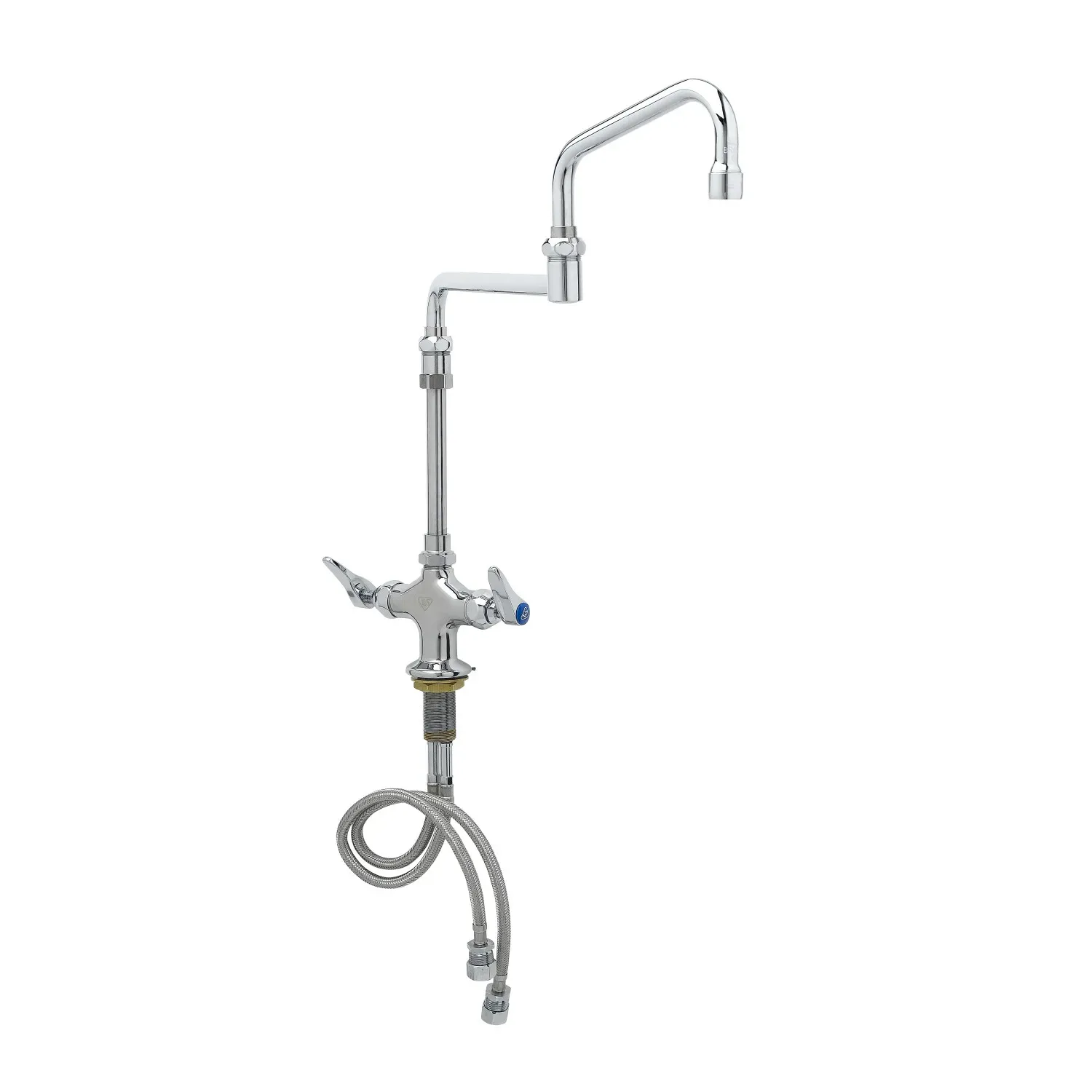 Facilitate Smooth Operation with the T&S Brass, B-0268-02, Faucet, Pantry. This single hole deck mount mixing faucet is designed to enhance efficiency in commercial restaurant settings. With its polished chrome plated brass body, it not only adds a touch of elegance to your pantry area but also ensures durability and longevity. The elevated 18" DJN and 7-5/8" extension provide ample space for maneuvering large pots and pans, making it easier to fill and clean them. The 18" double joint swing nozzle with 6" front and 12" back nozzles allows for precise water flow control, while the stream regulator outlet ensures a steady and consistent stream. The T&S Brass B-0268-02 is a reliable and efficient faucet that meets the demands of busy restaurant kitchens, offering convenience and functionality in every use.
