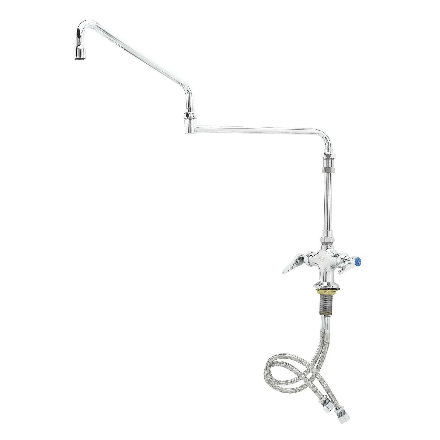 Enhance System Functionality with the T&S Brass, B-0268-04, Faucet, Pantry. This dual pantry faucet is designed to optimize efficiency in commercial restaurant settings. With its single hole base and elevated 24" DJN, this faucet provides easy access and flexibility for various tasks. The 7-5/8" extension further enhances its reach, allowing for convenient use in large sinks or prep areas. The polished chrome plated brass body not only adds a sleek and professional look but also ensures durability and longevity, even in high-volume environments. The 24" double joint swing nozzle with 12" front and back nozzles offers versatility, making it ideal for rinsing, filling, and cleaning tasks. The stream regulator outlet provides a steady and controlled flow of water, minimizing waste and maximizing efficiency. Trust T&S Brass, a reputable vendor in the industry, to deliver a reliable and high-performing faucet that meets the demands of any commercial restaurant operation.