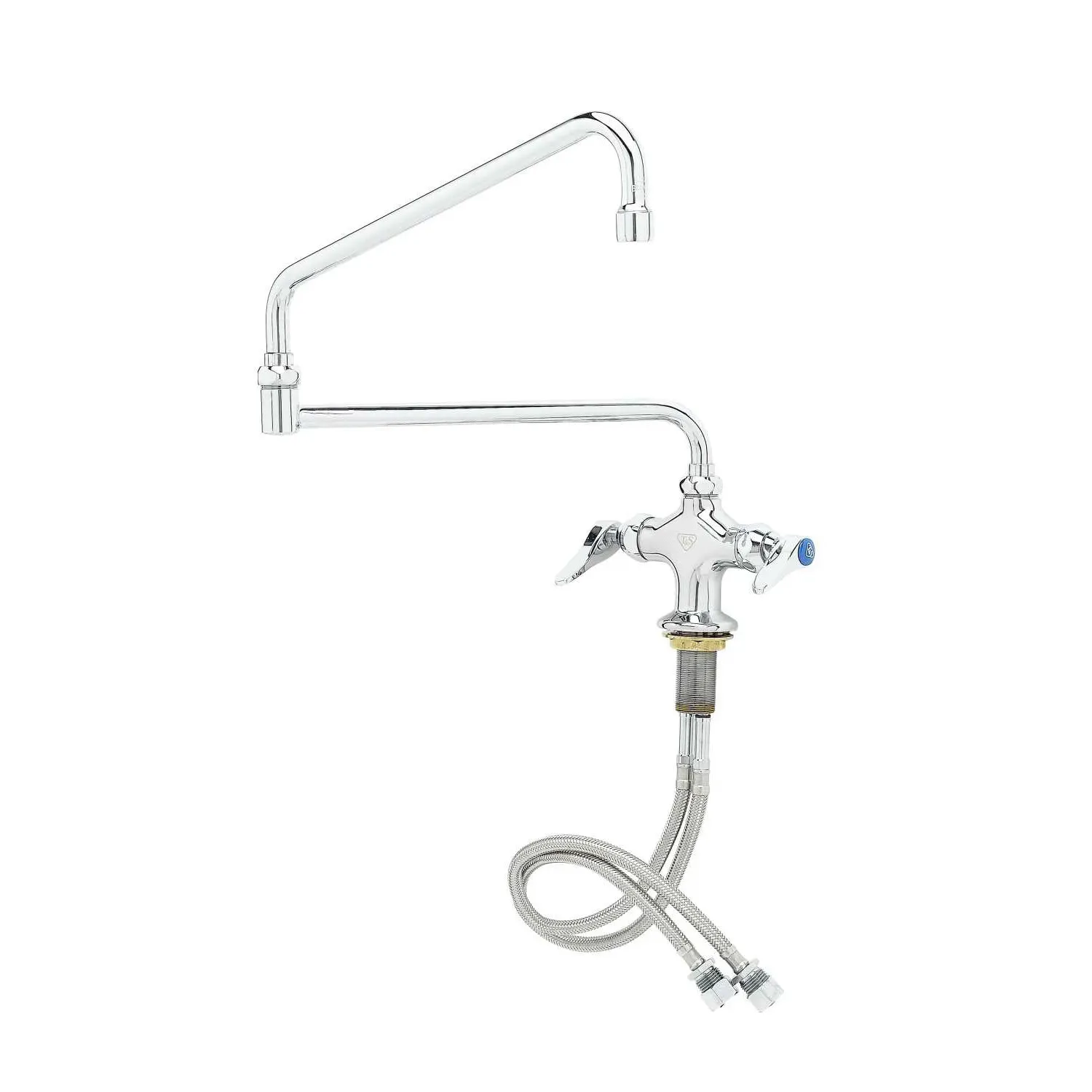 Optimize Operational Functionality with the T&S Brass, B-0268, Faucet, Pantry. This dual pantry faucet is designed to enhance efficiency in commercial restaurant settings. With its single hole base and special 24" double-joint swing nozzle, this faucet offers convenience and versatility. The polished chrome plated brass body ensures durability and a sleek appearance that complements any kitchen decor. The 24" double joint swing nozzle features 12" front and back nozzles, allowing for easy maneuverability and precise water flow control. The lock washer provided ensures a rigid application, minimizing the risk of leaks or malfunctions. Whether you're rinsing dishes, filling pots, or cleaning produce, this faucet is a reliable and efficient choice.