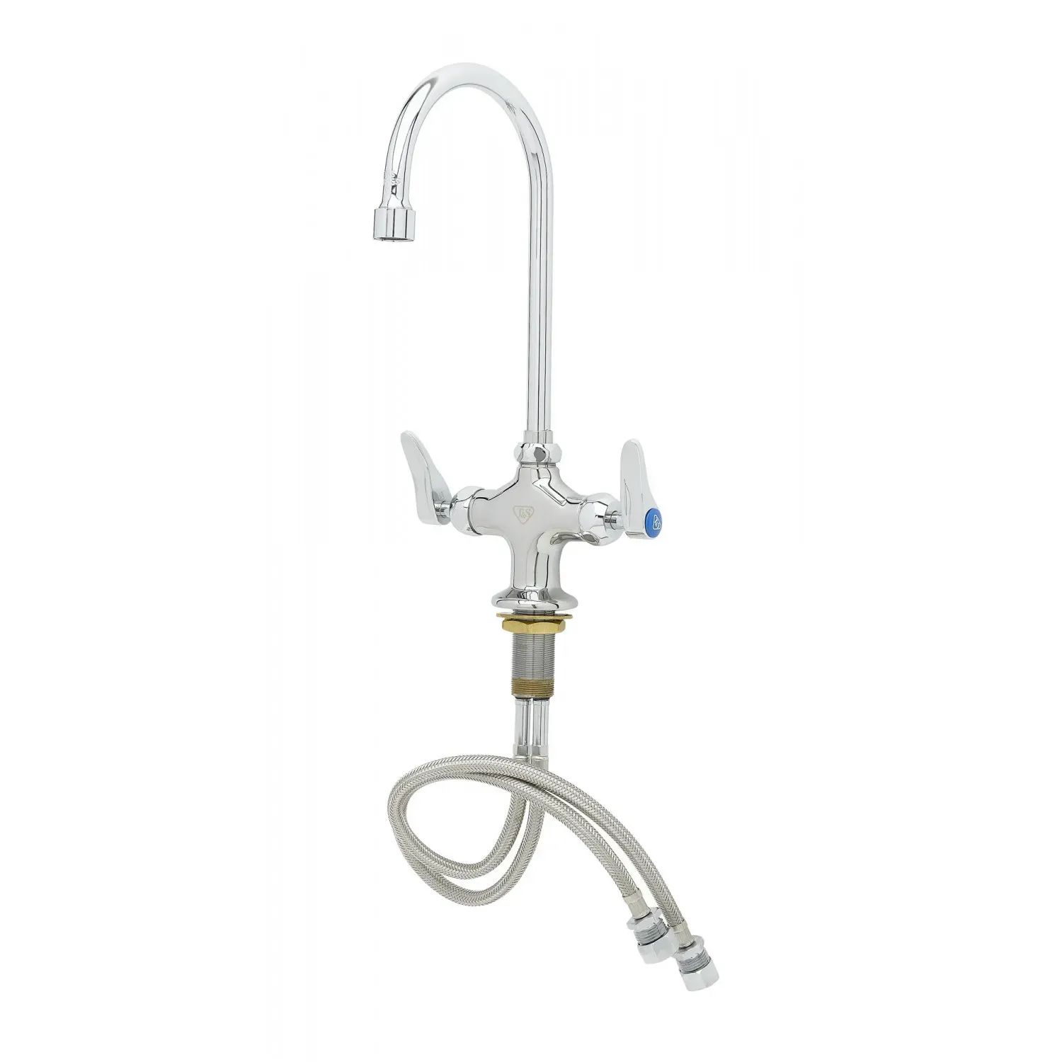 Optimize Equipment Function with T&S Brass, B-0301-01QT-WS, Faucet, Pantry. This single hole deck mount mixing faucet is a must-have for any commercial restaurant. With its polished chrome plated brass body, it not only adds a touch of elegance to your pantry area but also ensures durability and longevity. The 5 3/4" swivel/rigid gooseneck provides flexibility and convenience, allowing you to easily fill pots and pans of various sizes. The 1.5 GPM VR aerator ensures a steady and efficient water flow, saving you time and water consumption. Whether you need to quickly rinse vegetables or fill large containers, this faucet is up to the task. It comes with a lock washer for rigid application, ensuring stability and preventing leaks. Trust T&S Brass to deliver high-quality, reliable products that enhance the functionality of your commercial kitchen.