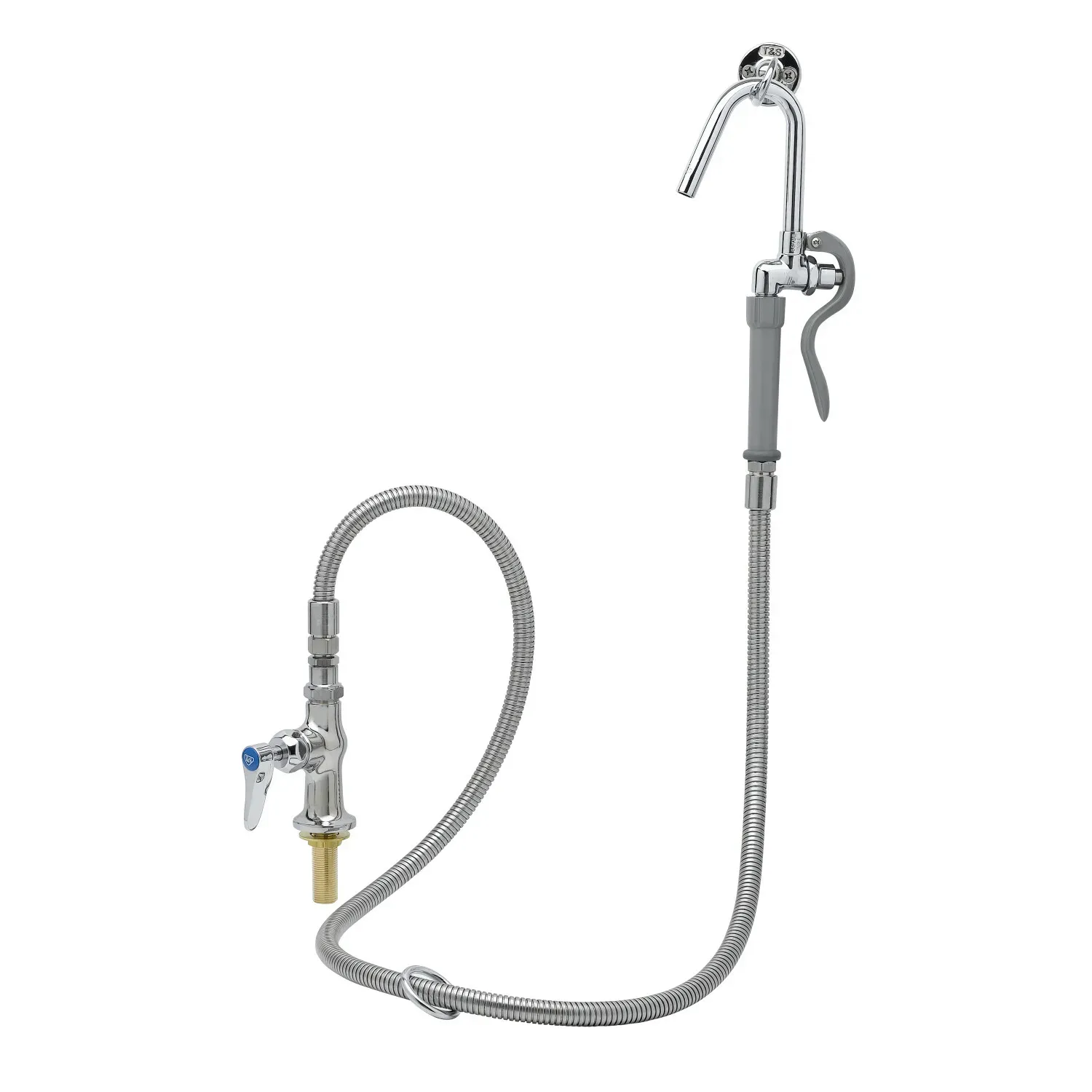Maintain Equipment Reliability with the T&S Brass, B-0305-102A-CR Faucet, Pantry. This single pantry base faucet is designed to meet the demands of a commercial restaurant setting. With its polished chrome plated brass body, it not only adds a touch of elegance to your kitchen but also ensures durability and longevity. The faucet features a single hole, single temperature deck mount design, making it easy to install and use. It comes with a B-0102-A hose and hook nozzle, providing versatility and convenience for various tasks. The 68" flexible stainless steel hose with a heat-resistant gray handle and hold down ring allows for easy maneuverability and ensures reliable performance. Whether you need to fill large pots or rinse off dishes, this faucet is up to the task. Trust T&S Brass to deliver exceptional quality and functionality for your restaurant's needs.