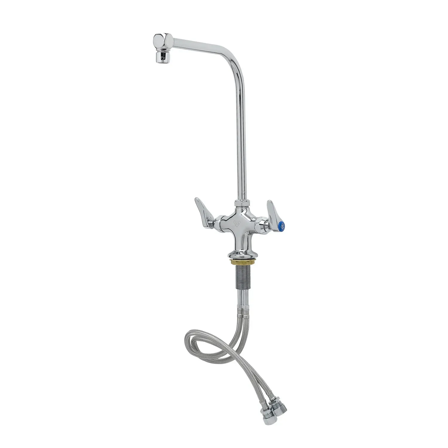 Ensure Reliable Functionality with the T&S Brass B-0318-03 Faucet, Pantry. This single-hole, high-arc gooseneck mixing faucet is designed to meet the demands of a busy commercial restaurant. With its lever handles and 2.2 GPM aerator, this faucet provides precise control over water flow and temperature, ensuring efficient and consistent performance. The polished chrome plated brass body not only adds a touch of elegance to your pantry area but also ensures durability and longevity, even in a high-traffic environment. The 8 11/16" 90 high-arc swivel/rigid gooseneck allows for easy filling of large pots and pans, while the lock washer provided ensures a secure and rigid application. Trust T&S Brass, a reputable vendor in the industry, to deliver a reliable and functional faucet that will enhance the efficiency of your commercial kitchen.