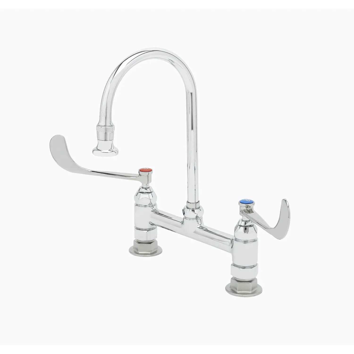 Upgrade Equipment Efficiency with the T&S Brass B-0322 Manual Faucet. Designed specifically for commercial restaurant use, this 8" deck mount faucet is a reliable and efficient choice for any kitchen. The polished chrome plated brass body ensures durability and longevity, while the 5 13/16" swivel/rigid gooseneck with a 2.2 GPM rosespray outlet provides flexibility and precision. The compression cartridges with spring checks guarantee smooth operation and prevent leaks. With 6" wrist action handles, this faucet offers easy control and accessibility. Certified to ASME A112.18.1/CSA B125.1, NSF 61-Section 9, and NSF 372, it meets the highest industry standards for safety and sanitation. Additionally, it complies with ADA ANSI/ICC A117.1 requirements, ensuring accessibility for all users. Upgrade your restaurant's equipment with the T&S Brass B-0322 Manual Faucet and experience improved efficiency and reliability in your kitchen.