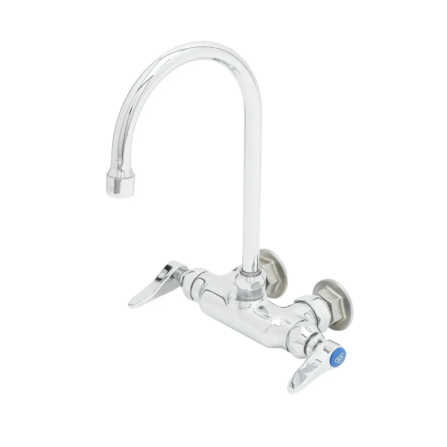 Ensure Efficient Functionality with the T&S Brass B-0345 Manual Faucet. Designed specifically for commercial restaurant use, this double pantry faucet offers exceptional performance and durability. The 3-3/8" wall mount design with lever handles allows for easy operation and precise control of water flow. The 5 3/4" swivel/rigid gooseneck provides flexibility and convenience, while the stream regulator outlet ensures a steady and consistent flow of water. With a polished chrome plated brass body, this faucet not only looks sleek but is also resistant to corrosion and tarnishing. The compression cartridges with spring checks ensure reliable performance and prevent leaks. Certified to meet ASME A112.18.1/CSA B125.1, NSF 61-Section 9, and NSF 372 standards, this faucet is both safe and reliable. Upgrade your restaurant's kitchen with the T&S Brass B-0345 Manual Faucet for efficient and hassle-free operation.