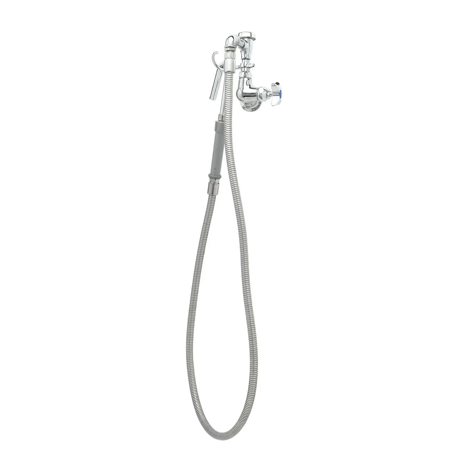 Maximize System Integrity with the T&S Brass B-0606 Faucet, Kettle / Pot Filler. This wall-mounted pot filler is designed to meet the demands of a busy commercial restaurant kitchen. With its single control operation, you can easily fill large pots and kettles without the hassle of multiple handles. The atmospheric vacuum breaker ensures the safety and integrity of your water supply, preventing backflow contamination. The 68" flexible stainless steel hose provides ample reach and is equipped with a heat-resistant gray handle and hold-down ring for added convenience and durability. Whether you're filling stockpots for soups or boiling water for pasta, this pot filler is a reliable and efficient tool. Trust in T&S Brass, a reputable vendor known for their quality and innovation in the industry. Upgrade your kitchen with the T&S Brass B-0606 Faucet, Kettle / Pot Filler and experience enhanced productivity and peace of mind.