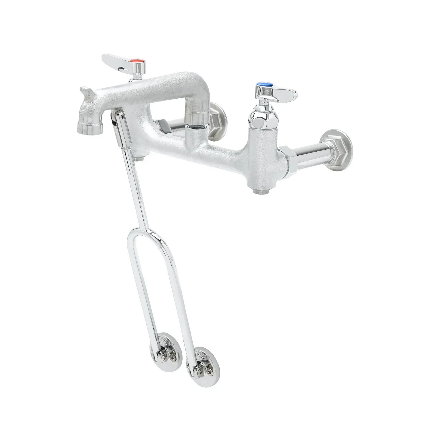 Optimize Usage Efficiency with T&S Brass, B-0650-BSTR, Manual Faucets. This service sink faucet is designed specifically for commercial restaurant use, offering exceptional performance and durability. The wall mount design with 8" centers ensures easy installation and convenient access to water. The built-in stops allow for quick and efficient maintenance, minimizing downtime and maximizing productivity in a busy restaurant environment. The rough chrome finish adds a sleek and professional look to any kitchen or service area. With a compression cartridge and spring checks, this faucet provides reliable water flow and prevents backflow contamination. The lever handle offers easy operation, even with wet or soapy hands. Certified to meet industry standards, including ASME A112.18.1/CSA B125.1, NSF 61-Section 9, and NSF 372, this faucet ensures compliance with health and safety regulations. Upgrade your restaurant's efficiency and functionality with the T&S Brass B-0650-BSTR Manual Faucet.