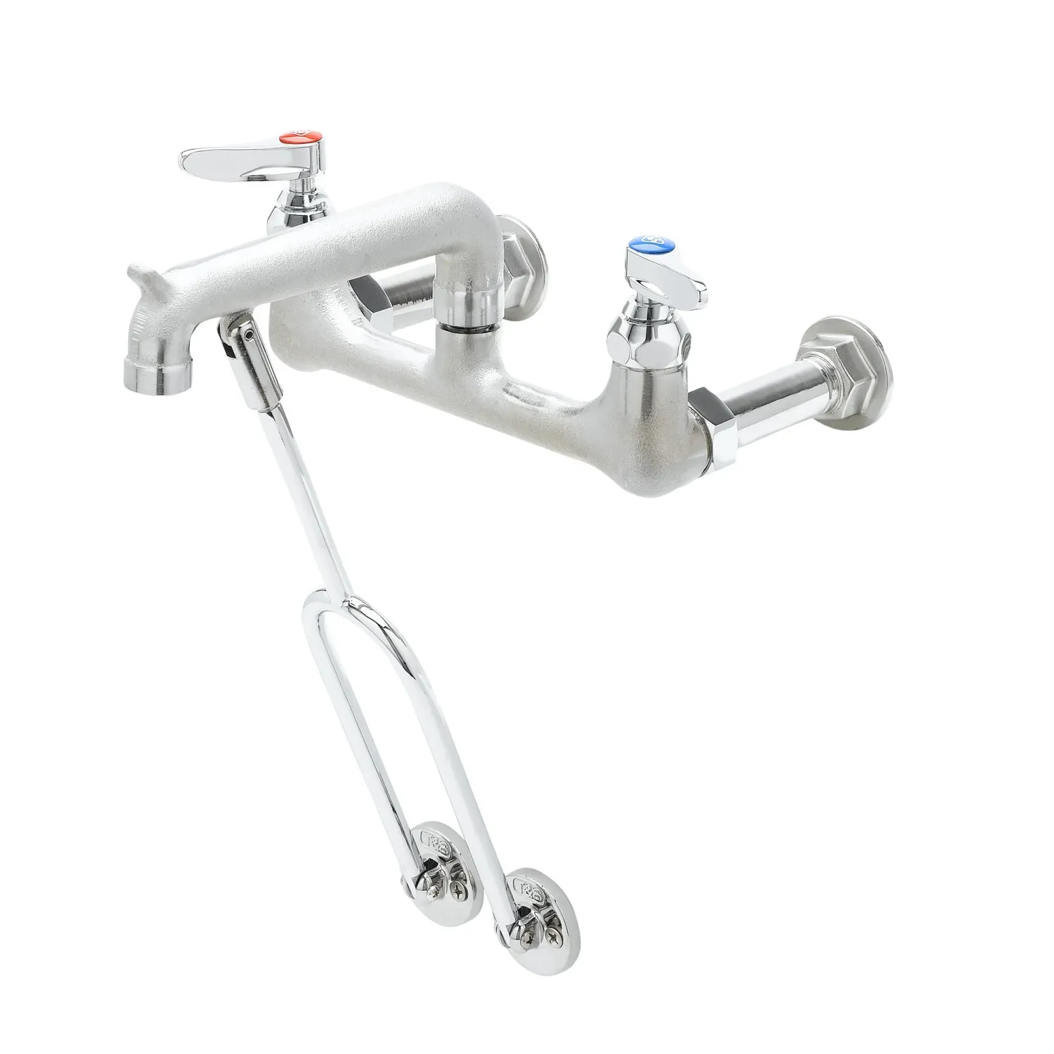 Maximize productivity levels with the T&S Brass B-0650-RGH Manual Faucet. Designed specifically for commercial restaurant use, this wall-mounted faucet is perfect for service sinks. With its 8" centers and wall brace, it provides stability and convenience in any busy kitchen. The rough chrome finish adds durability and a sleek look to complement any decor.