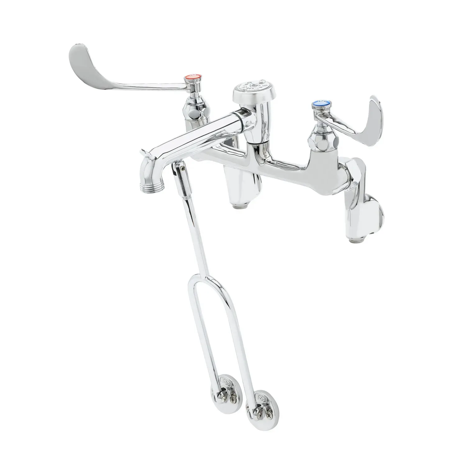 Optimize Equipment Function with the T&S Brass B-0655-01 Manual Faucet. This wall-mounted service sink faucet is designed for commercial restaurant use, offering adjustable centers and built-in stops for added convenience. The polished chrome plated brass body and spout with a vacuum breaker ensure durability and reliability in high-demand environments. The faucet also features a pail hook and a garden hose male outlet, providing versatility for various tasks. With compression cartridges and spring checks, this faucet delivers precise control and prevents backflow. The 6" wrist action handles allow for easy operation, even with wet or soapy hands. Certified to meet ASME, CSA, NSF, and ADA requirements, this faucet guarantees compliance with industry standards. Upgrade your restaurant's functionality with the T&S Brass B-0655-01 Manual Faucet, a reliable and efficient choice for any commercial kitchen.