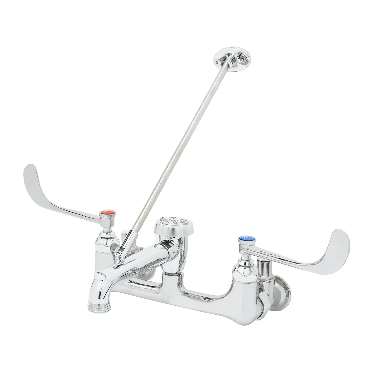 Secure System Operation with T&S Brass, B-0658, Manual Faucets. This service sink faucet is designed for commercial restaurant use, offering reliable performance and durability. The wall mount design with 8" centers ensures easy installation and convenient access to water. The polished chrome plated brass body and spout with a vacuum breaker not only provide a sleek and professional look but also prevent backflow and contamination. The faucet features compression cartridges with spring checks for smooth operation and 6" wrist action handles for easy control. With 1/2" NPT female inlets and loose key stops, this faucet offers flexibility and convenience. It is certified to meet various industry standards, including ASME A112.18.1/CSA B125.1, NSF 61 Section 9, NSF 372, and ASSE 1001. Additionally, it meets ADA ANSI/ICC A117.1 requirements, ensuring accessibility for all users. Trust T&S Brass for secure and efficient system operation in your commercial restaurant.