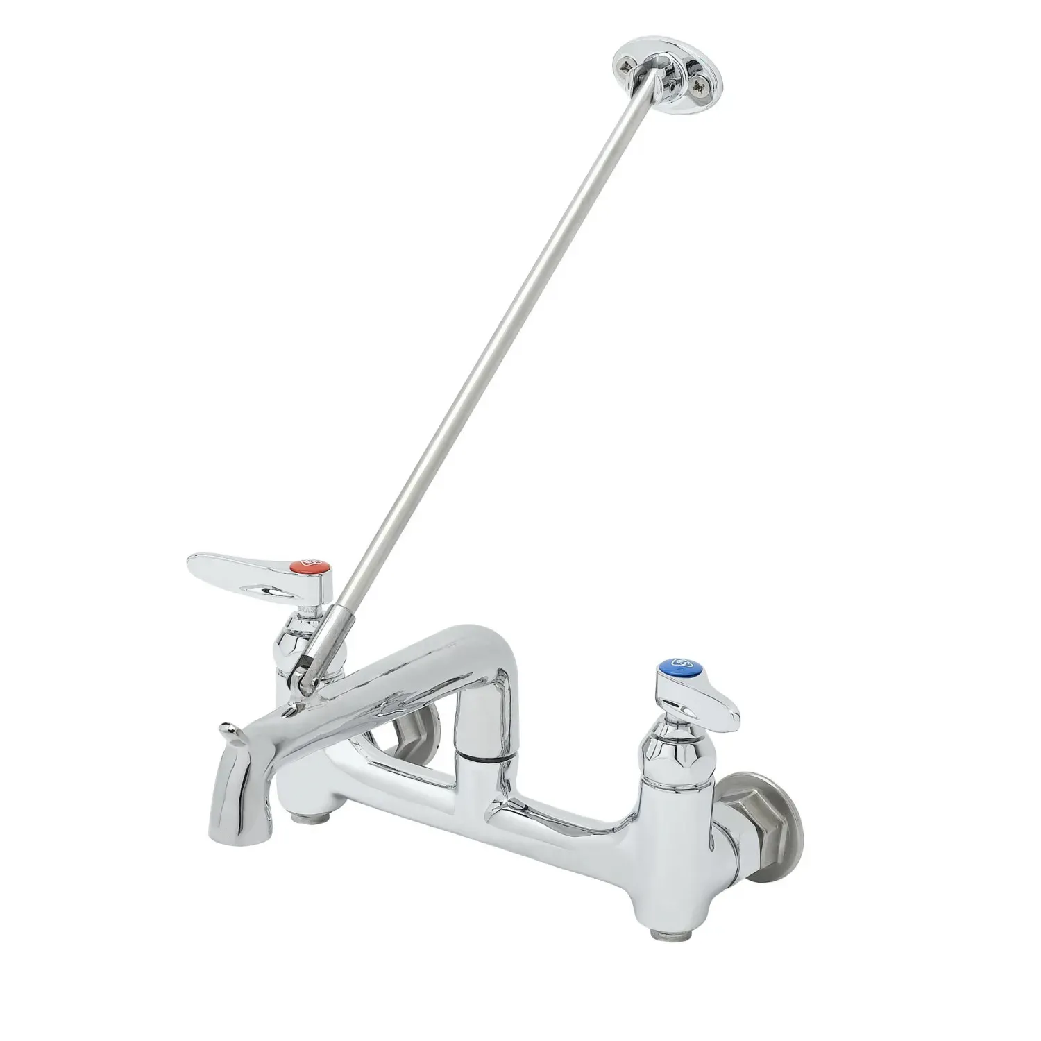 Optimize Usage Efficiency with T&S Brass, B-0660-BSTP, Manual Faucets. This service sink faucet is designed specifically for commercial restaurant use, offering exceptional functionality and durability. The wall mount design with 8" centers ensures easy installation and convenient access to water. The polished chrome finish adds a touch of elegance to any kitchen or utility area. With built-in stops and a wall brace, this faucet provides added stability and control. The brass body and spout are chrome plated for long-lasting performance, while the pail hook and plain end outlet offer versatility for various tasks. The compression cartridges with spring checks and lever handles ensure smooth operation and precise water flow. Certified to meet ASME, CSA, NSF, and ADA requirements, this faucet is a reliable choice for any commercial kitchen. Upgrade your restaurant's efficiency with T&S Brass, B-0660-BSTP, Manual Faucets.