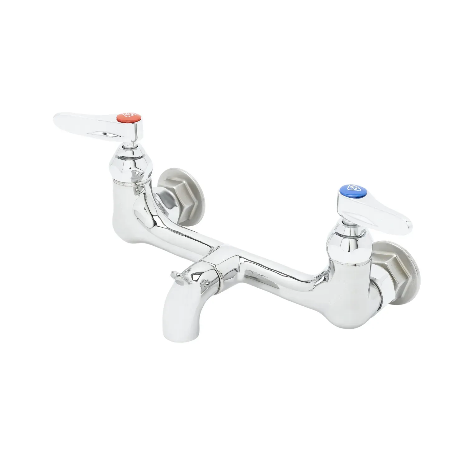 Manage Equipment Accessories with T&S Brass, B-0672-POL, Manual Faucets. This service sink faucet is designed specifically for commercial restaurant use, offering convenience and durability. With its wall mount design and 8" centers, it provides easy installation and accessibility. The polished chrome plated brass body and spout not only add a sleek and professional look to your restaurant's sink area but also ensure long-lasting performance. The faucet features a pail hook and plain end outlet, allowing you to efficiently manage equipment accessories and handle various tasks. Equipped with compression cartridges with spring checks and lever handles, this faucet offers smooth operation and precise control of water flow. It is certified to meet industry standards, including ASME A112.18.1/CSA B125.1, NSF 61-Section 9, and NSF 372. Additionally, it meets ADA ANSI/ICC A117.1 requirements, ensuring accessibility for all users. Upgrade your restaurant's sink area with the T&S Brass B-0672-POL service sink faucet and experience enhanced functionality and reliability.