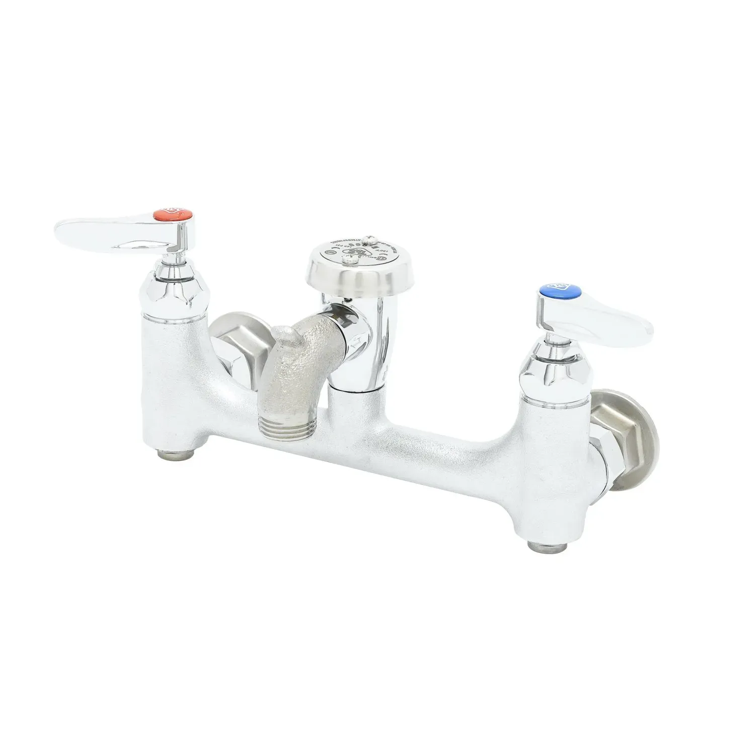 Enhance System Reliability with the T&S Brass B-0674-BSTR Manual Faucet. Designed specifically for commercial restaurant use, this wall-mounted faucet is built to last. With its rough chrome plated brass body and spout, it offers durability and resistance to corrosion. The faucet features an 8" center design, making it easy to install and compatible with most sinks. It also includes a vacuum breaker, pail hook, and garden hose male outlet for added convenience. The compression cartridges with spring checks ensure smooth operation and prevent leaks. The lever handles provide easy control of water flow and temperature. Additionally, the faucet is certified to meet various industry standards, including ASME A112.18.1/CSA B125.1, NSF 61 - Section 9, NSF 372, and ASSE 1001. Trust the T&S Brass B-0674-BSTR Manual Faucet to enhance the reliability of your restaurant's plumbing system.